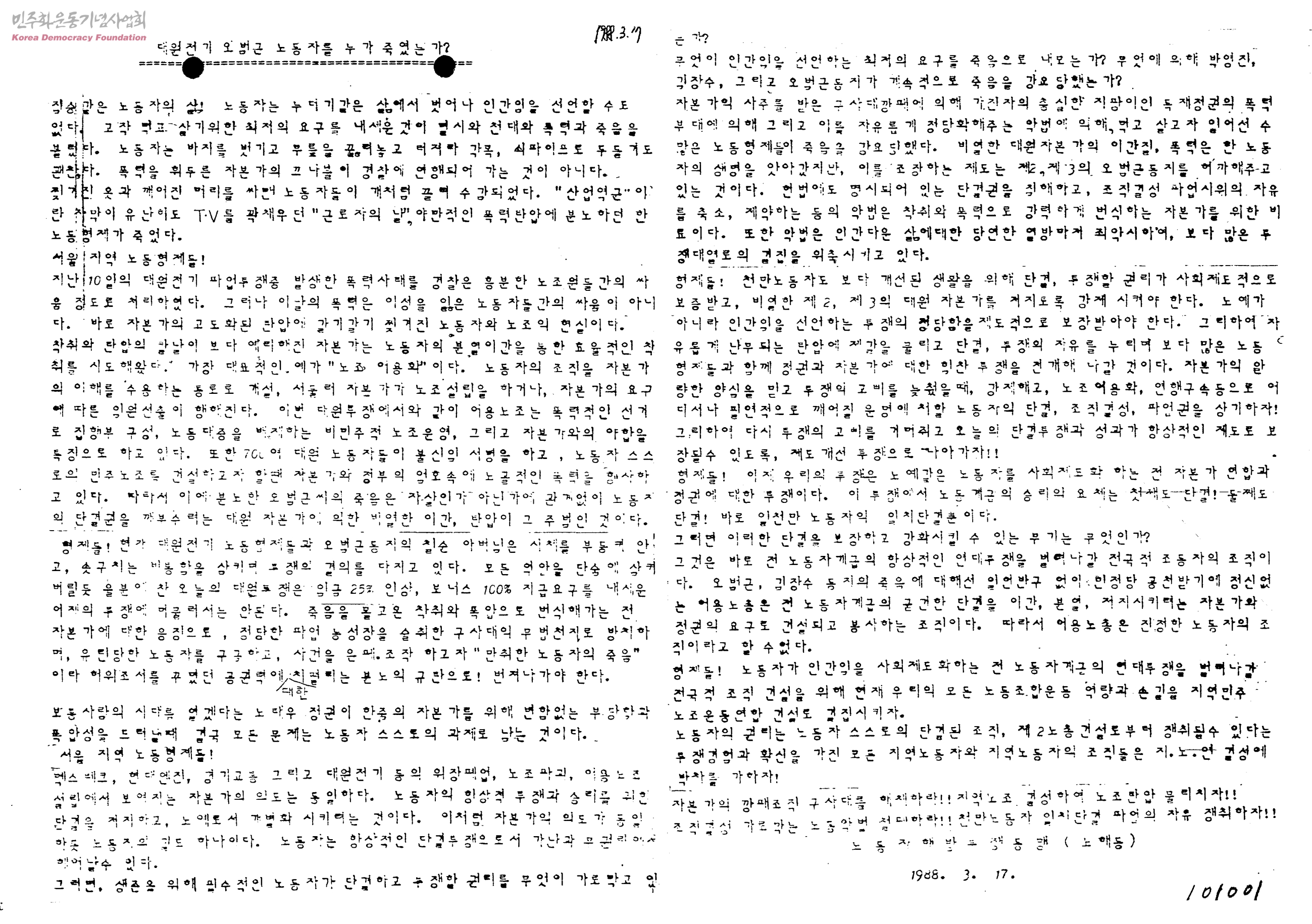 대원전기 오범근 노동자를 누가 죽였는가?