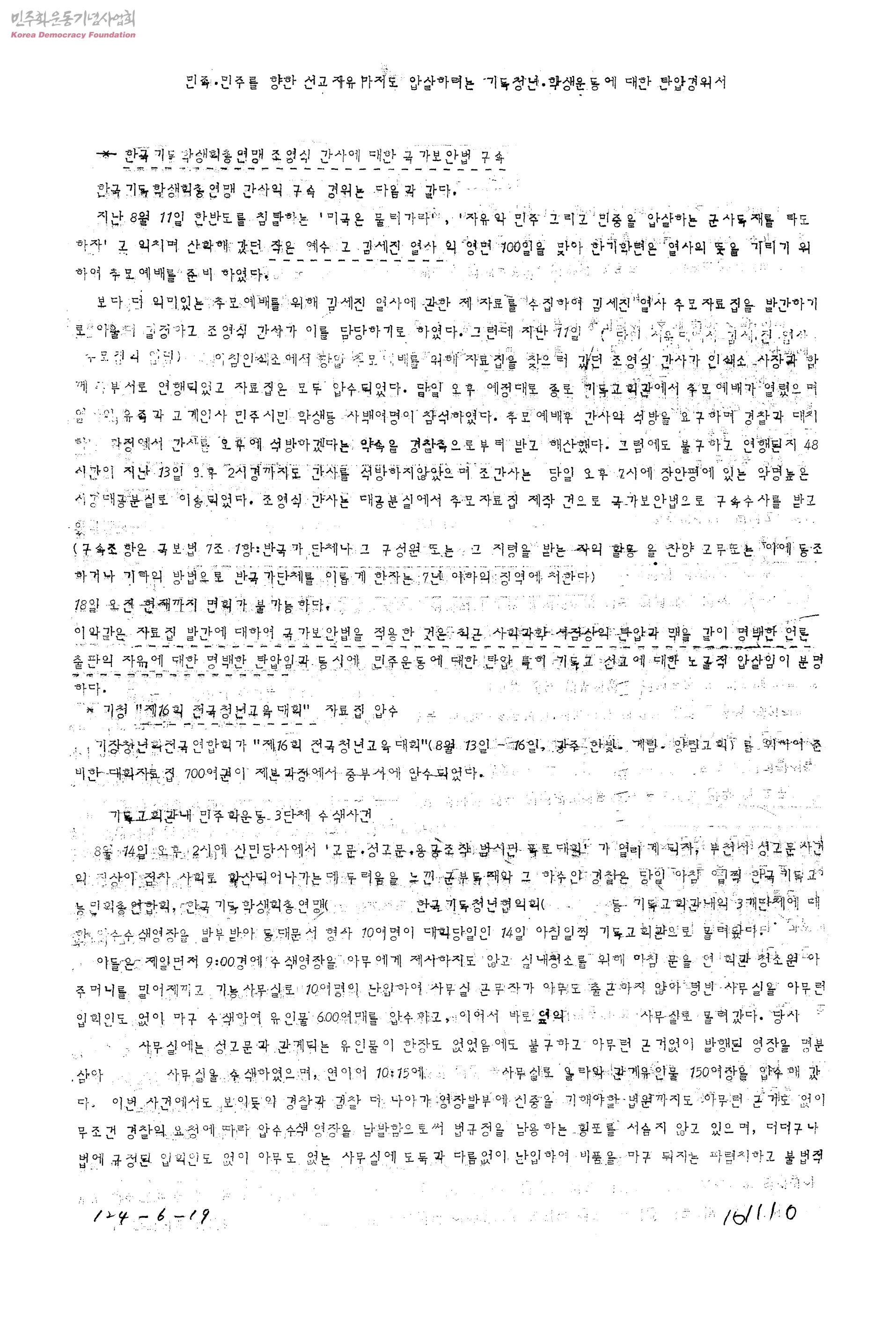 민족ㆍ민주를 향한 선교자유 마저도 압살하려는 기독청년ㆍ학생운동에 대한 탄압경위서