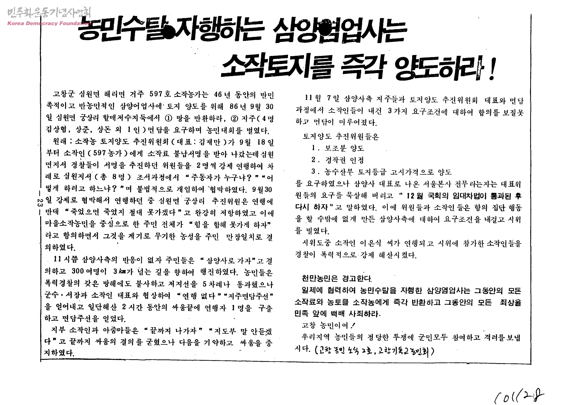 농민수탈 자챙하는 삼양염업사는 소작토지를 즉각 양도하라!