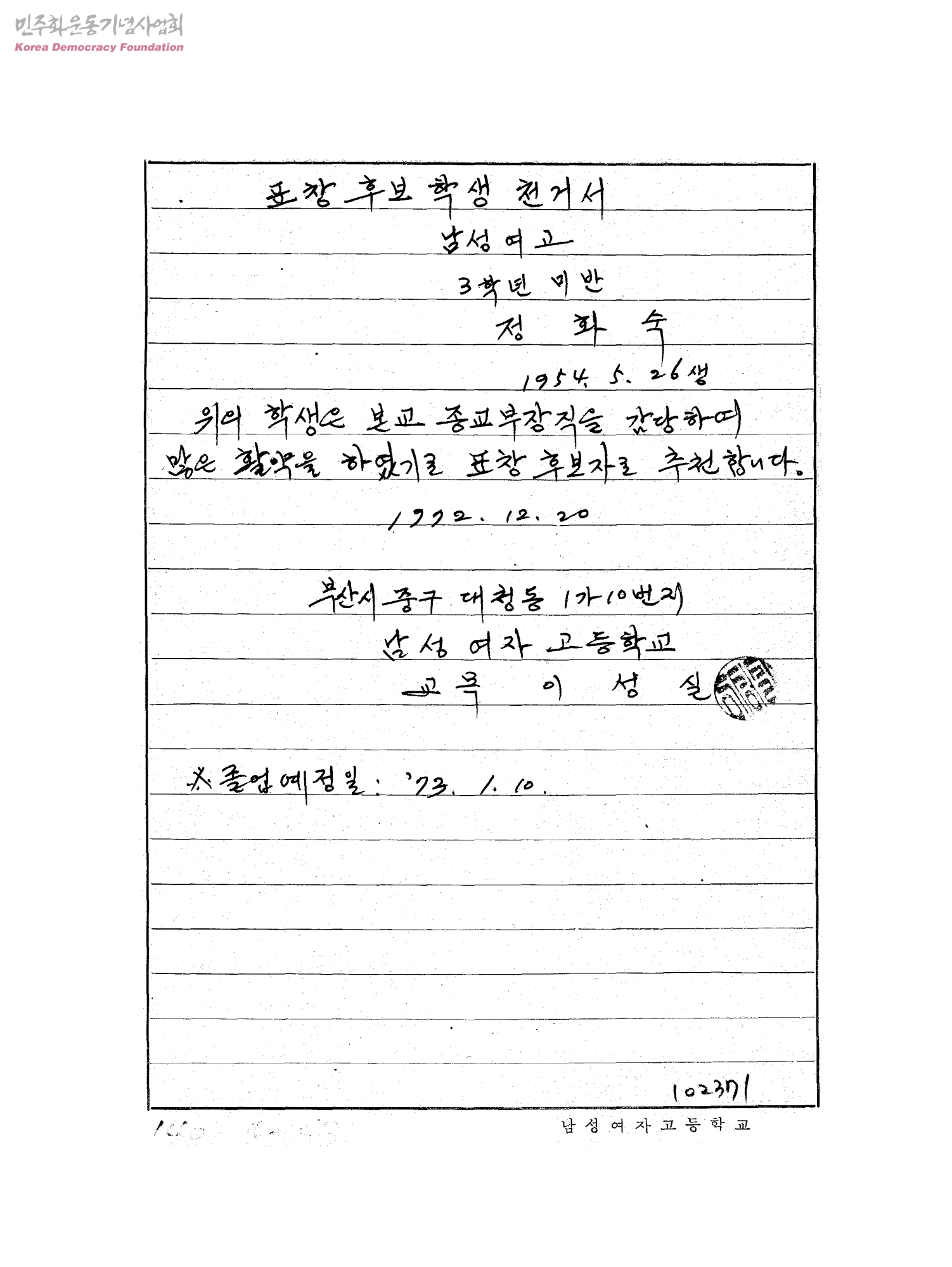 표창 후보 학생 천거서[기독학생회 공로자 추천]