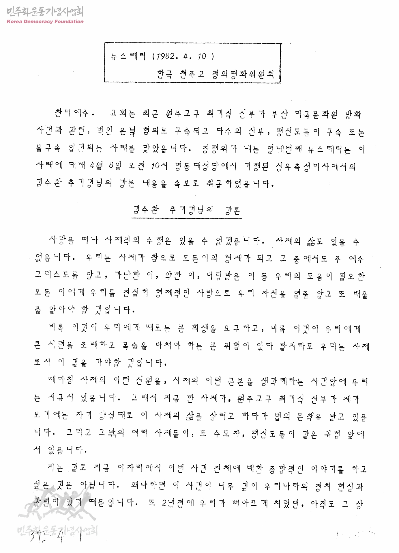 뉴스레터(1982.4.10)한국 천주교 정의평화위원회-김수환 추기경님의 강론