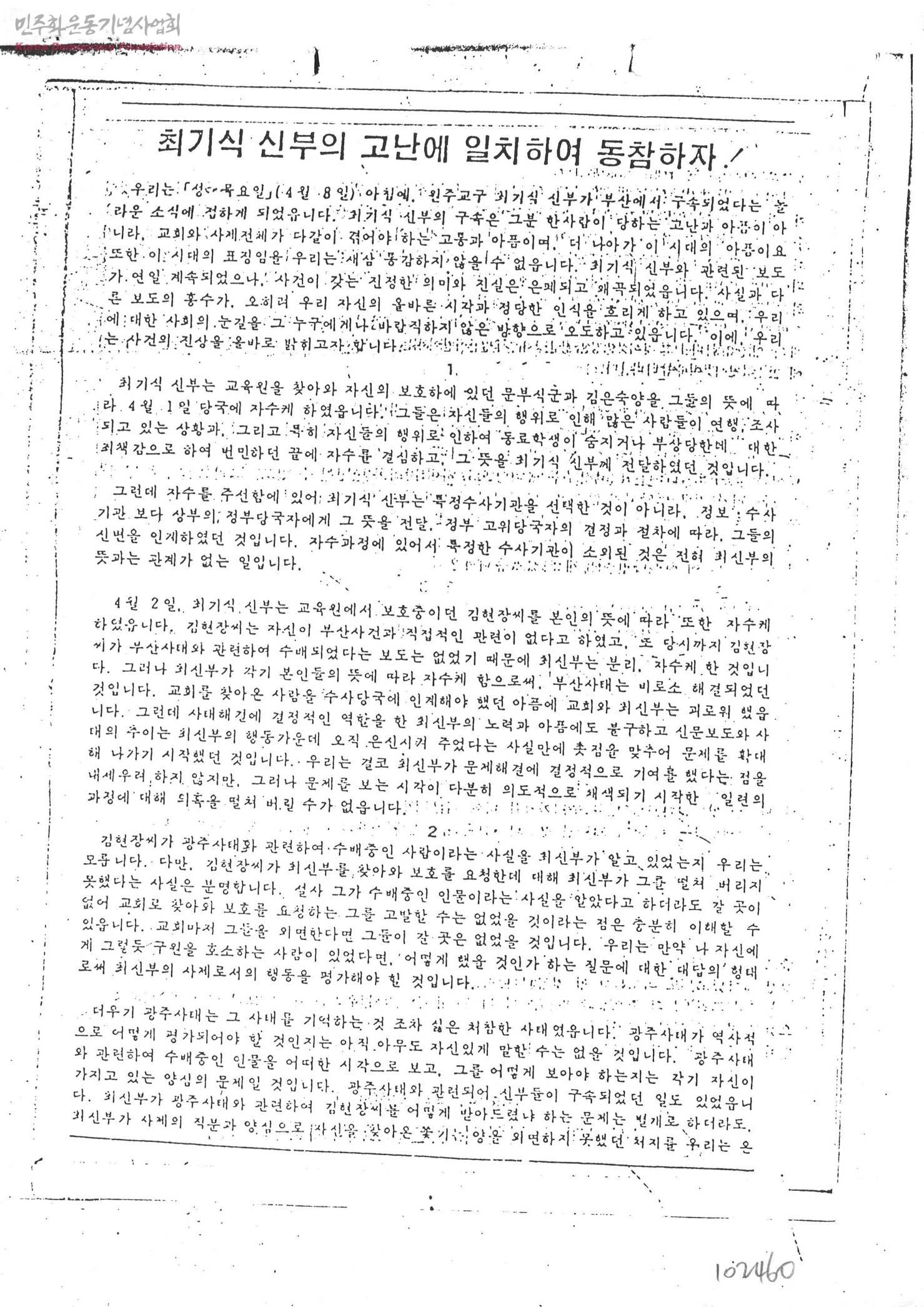 - 미국문화원방화사건 관련자 은닉죄로 구속된 최기식 신부관련 내용