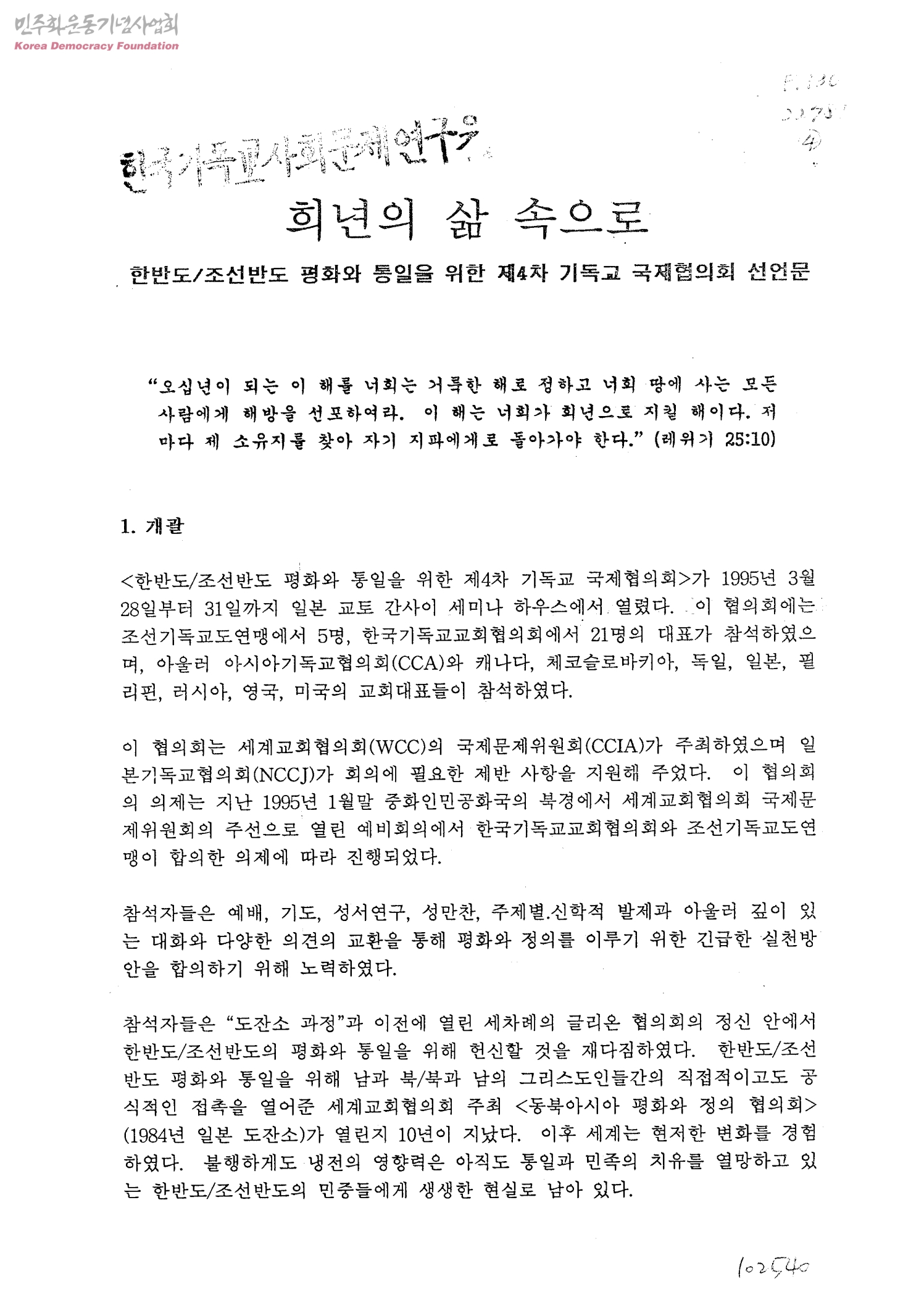 희년의 삶 속으로-한반도/조선반도 평화와 통일을 위한 제4차 기독교 국제협의회 선언문