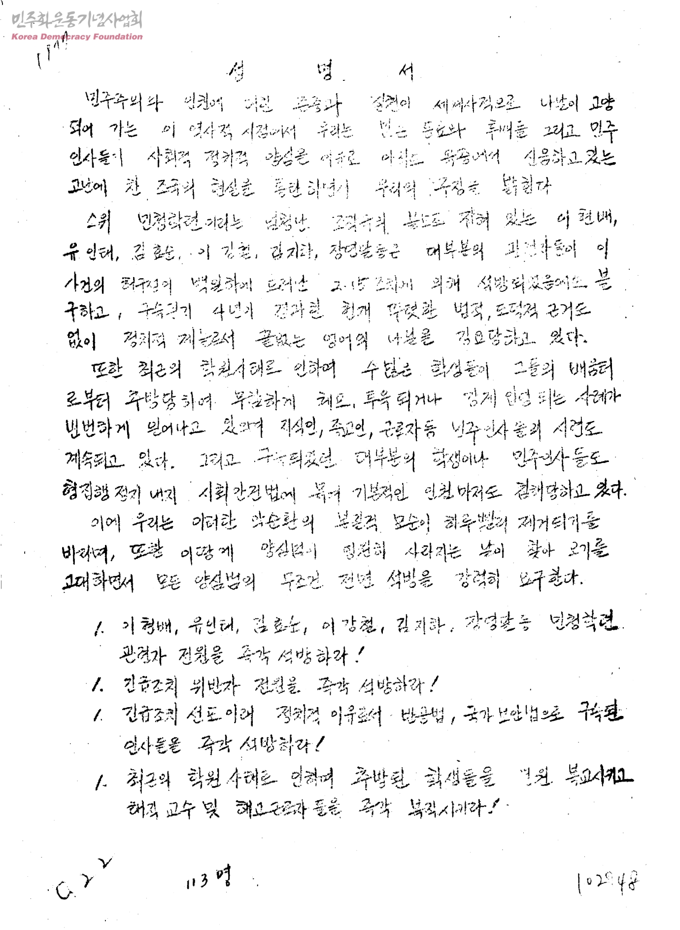 성명서[민주주의 인권보호에 대하여, 구속자 석방촉구]