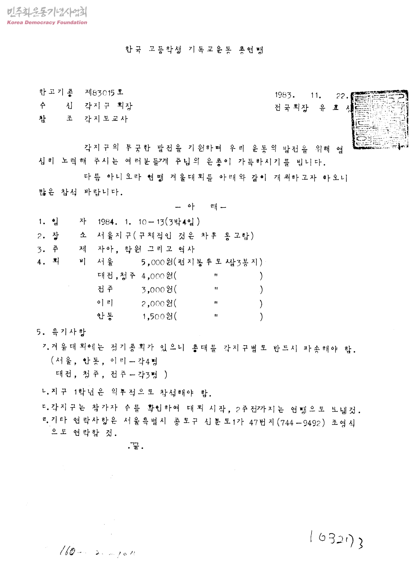 [한국고등학생기독교운동총연맹회장이 연맹 겨울대회에 대해 각지구 회장들에게 보내는 문서]