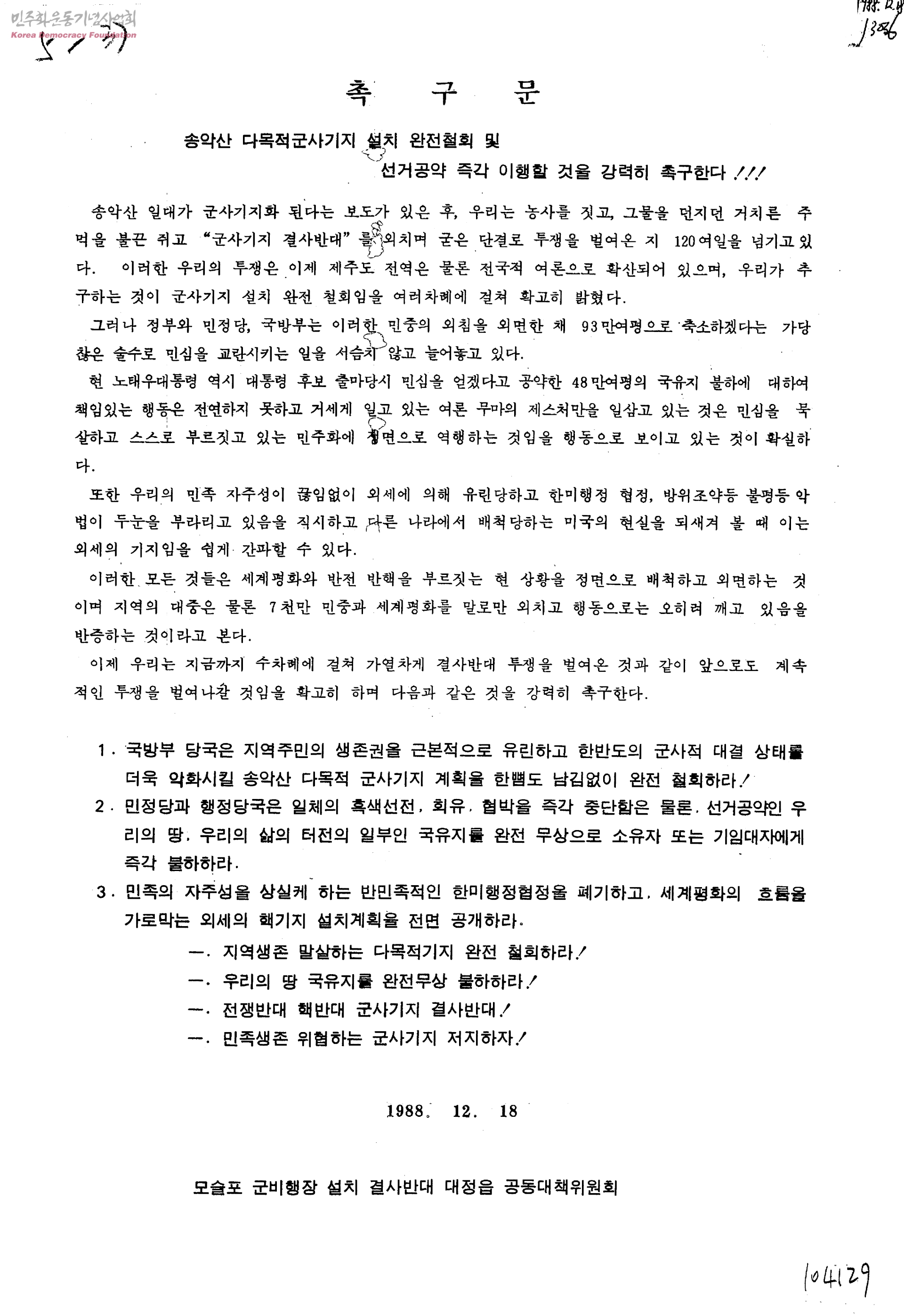 촉구문-송악산 다목적군사기지 설치 완전철회 및 선거공약 즉각 이행할 것을 강력히 촉구한다