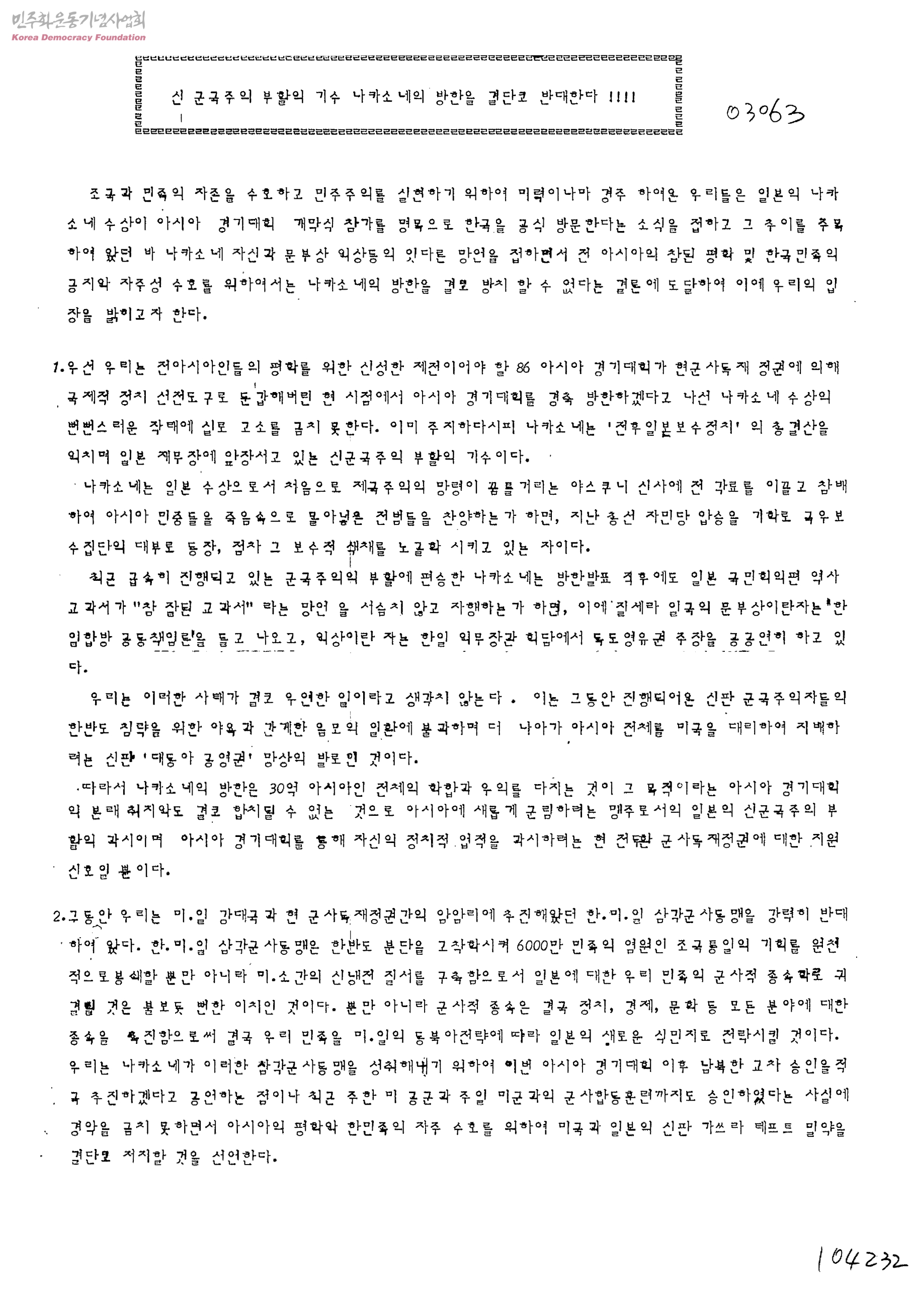 신 군국주의 부활의 기수 나카소네의 방한을 결단코 반대한다