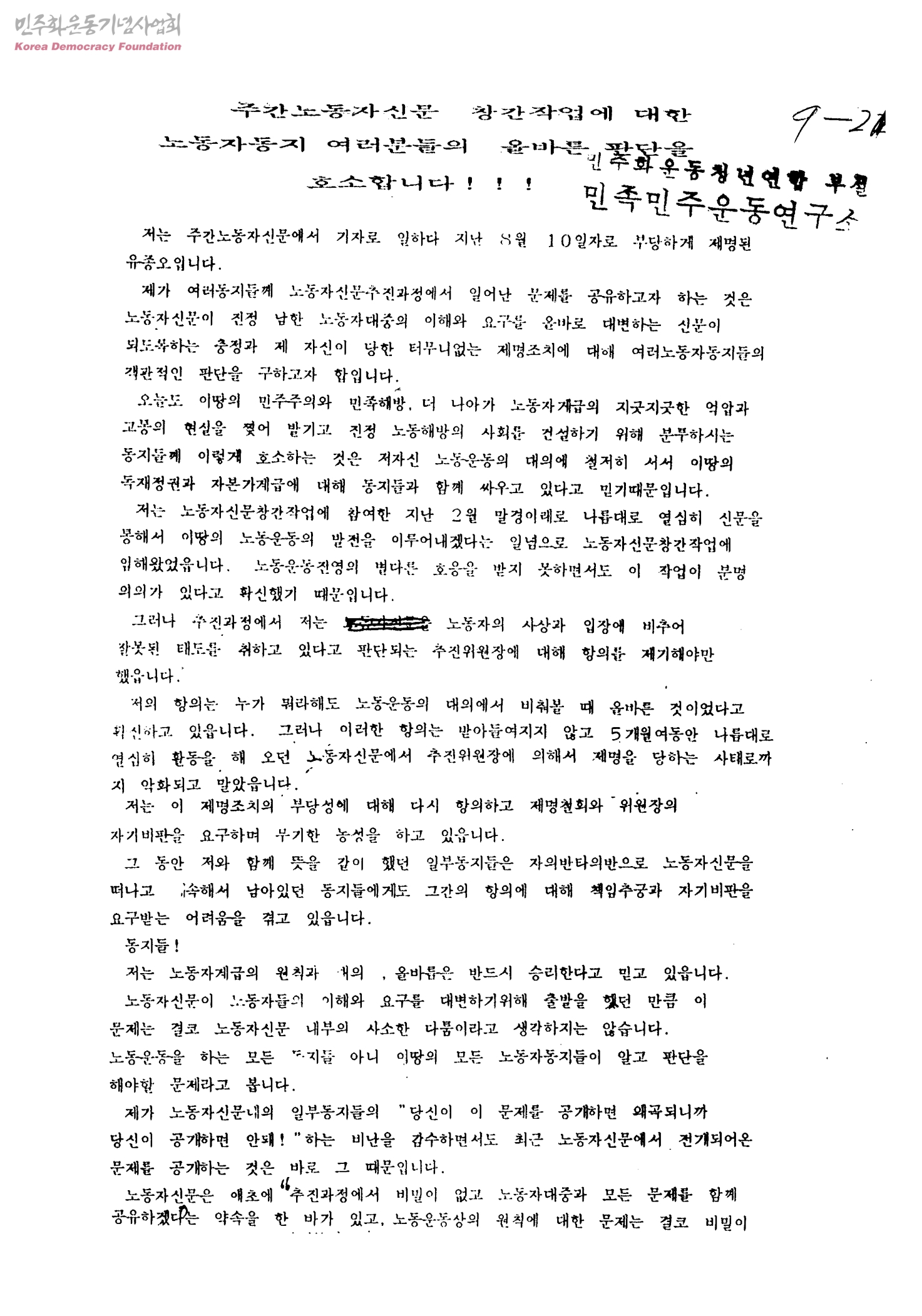 주간노동자신문 창간작업에 대한 노동자동지 여러분들의 올바른 판단을 호소합니다!!!