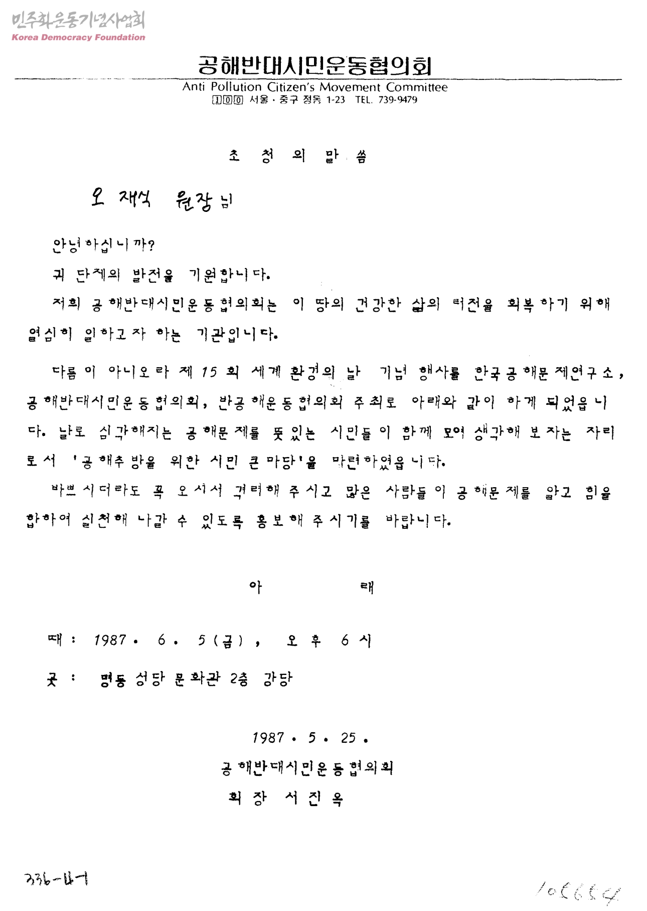 [공해반대시민운동협의회가 오재식원장에게 보내는 제15회 세계환경의날기념행사 참석요청관련 편지]