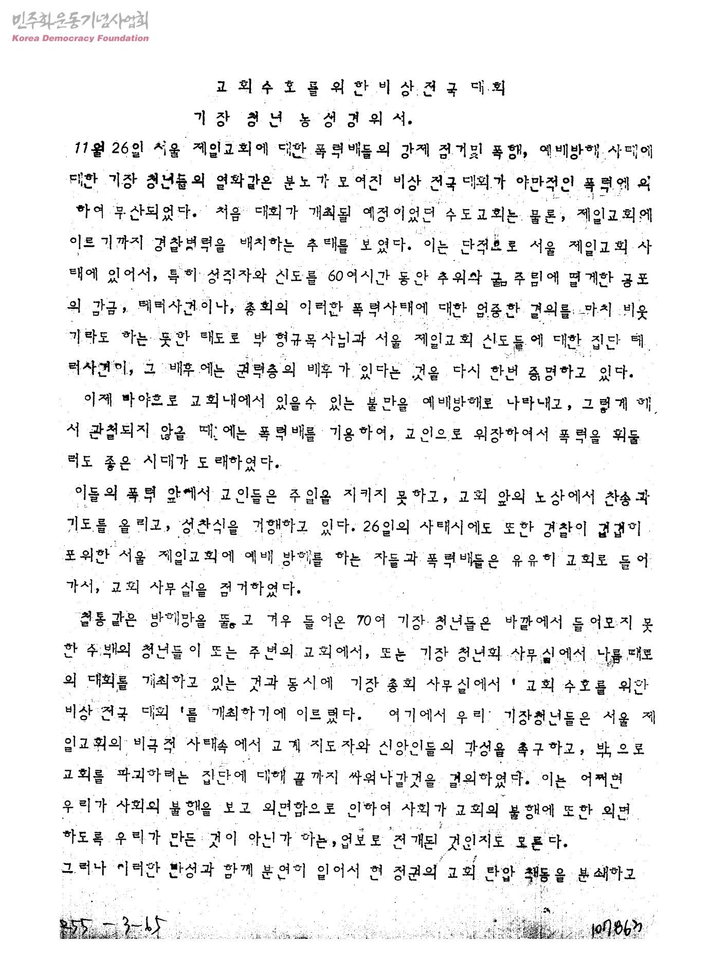 교회수호를 위한 비상전국대회 기장 청년 농성경위서