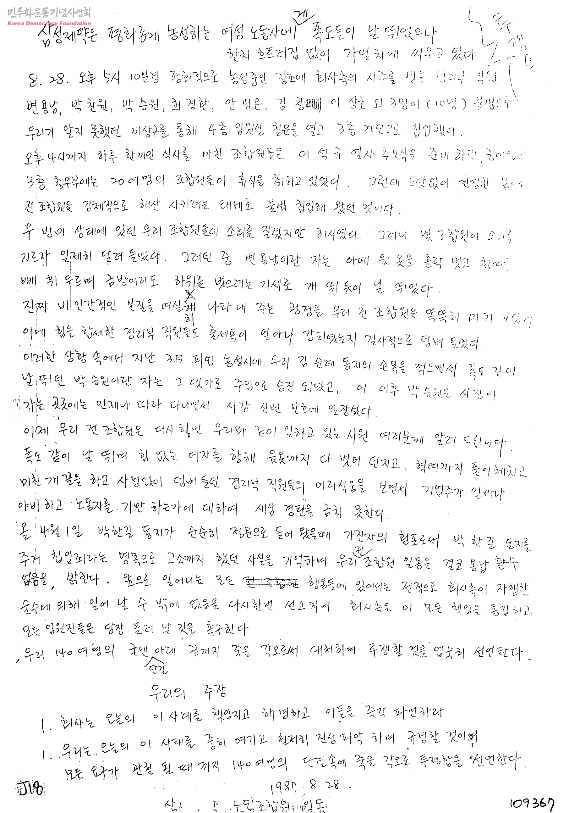 삼성제약은 평화롭게 농성하는 여성 노동자에게 폭도들이 날뛰었으나 한치 흐트러짐없이 가열차게 싸우고 있다