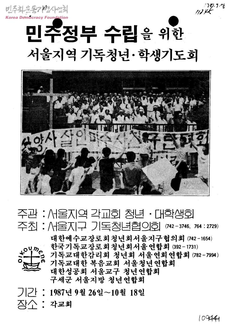 [민주정부 수립을 위한 서울지역 기독청년ㆍ학생기도회 안내문]