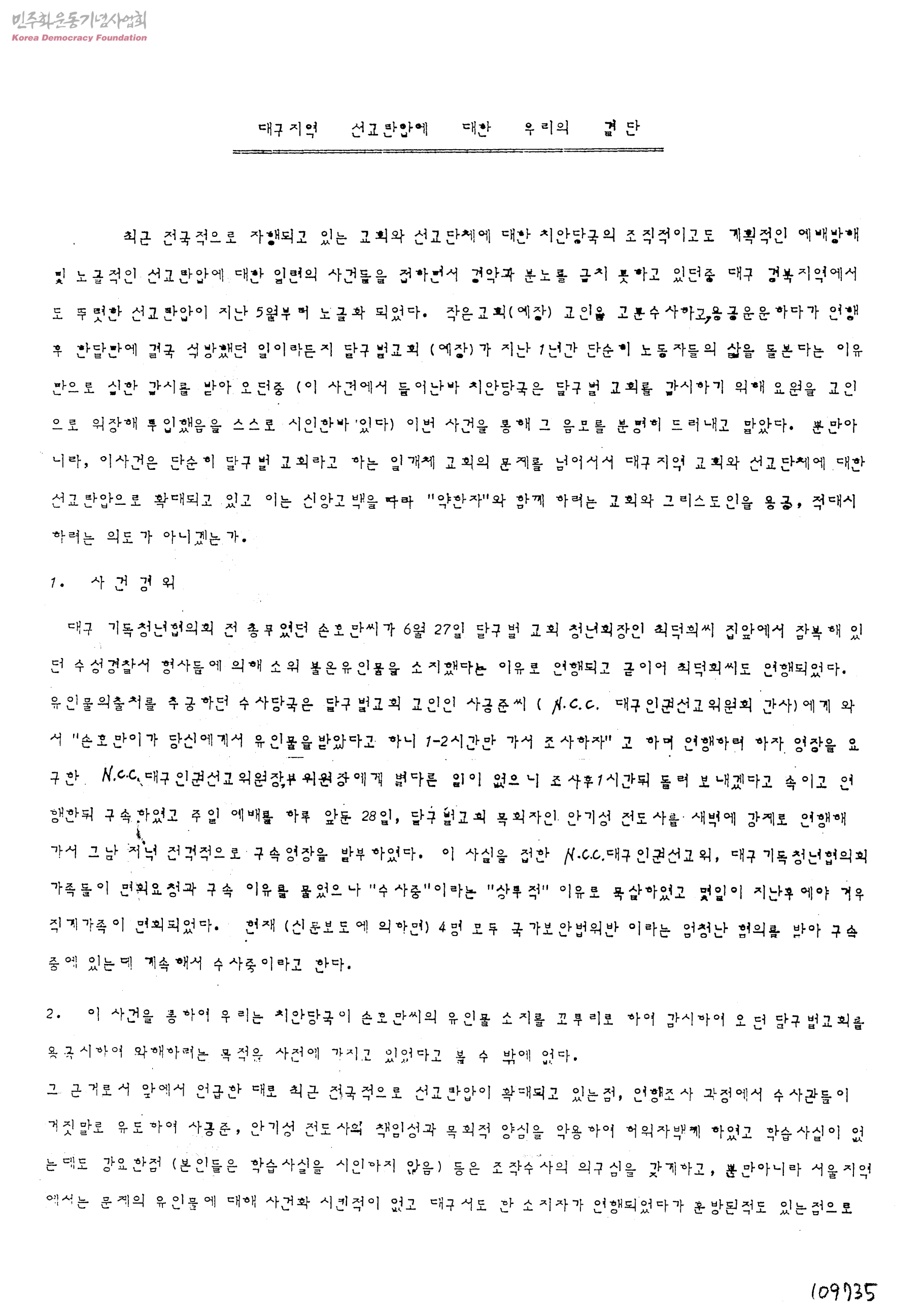 - 한국기독교협의회대구인권선교위원회, 대구ㆍ경북지역목회자정의, 평화실천협의회, 대구지구기독청년협의회, 경북기독교농민회