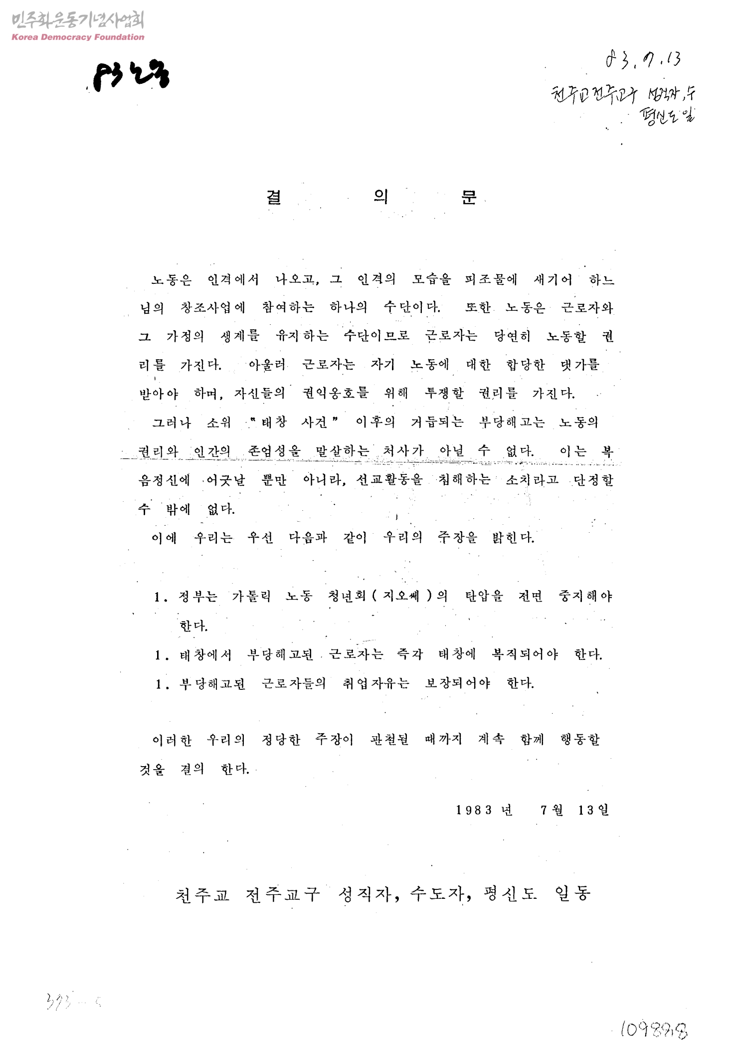 결의문[태창 부당해고자 복직, 부당해고자 취업자유 보장, 가톨릭노동청년회 탄압 중지]