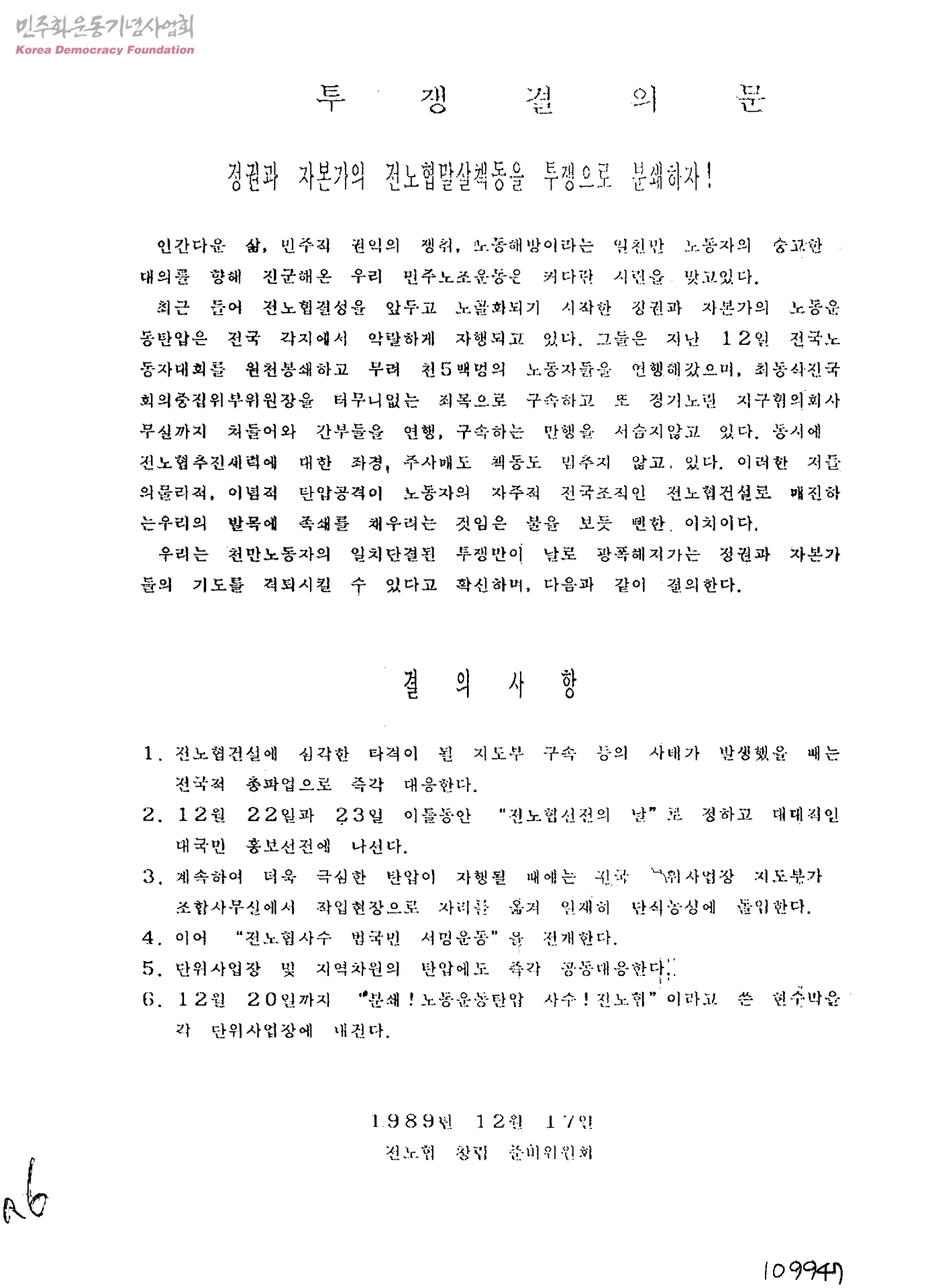 투쟁결의문-정권과 자본가의 전노협말살책동을 투쟁으로 분쇄하자!