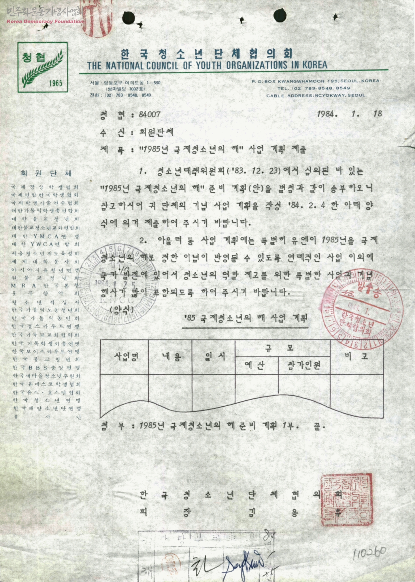 1985년 국제청소년의 해 사업 계획 제출[수신:한국청소년단체협의회 회원단체, 발신:한국청소년단체협의회]