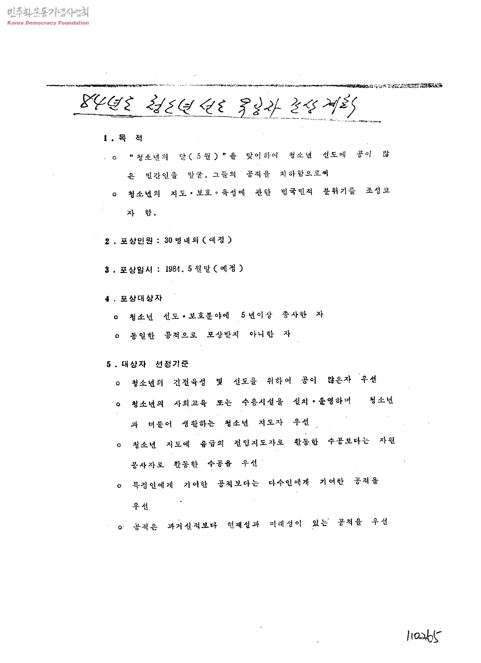 84년도 청소년 선도 유공자 포상 계획