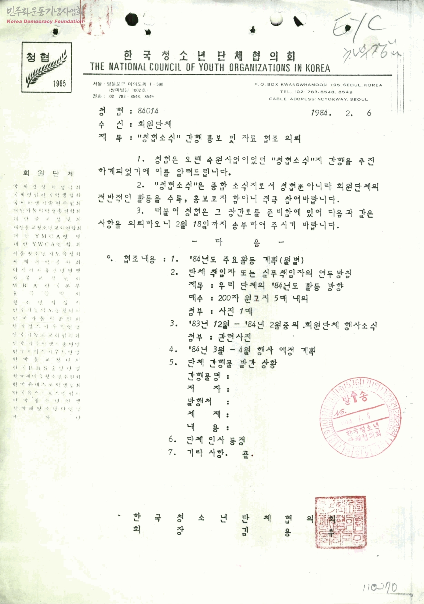 청협소식 간행 홍보 및 자료 협조 의뢰[수신:한국청소년단체협의회 회원단체, 발신:한국청소년단체협의회]
