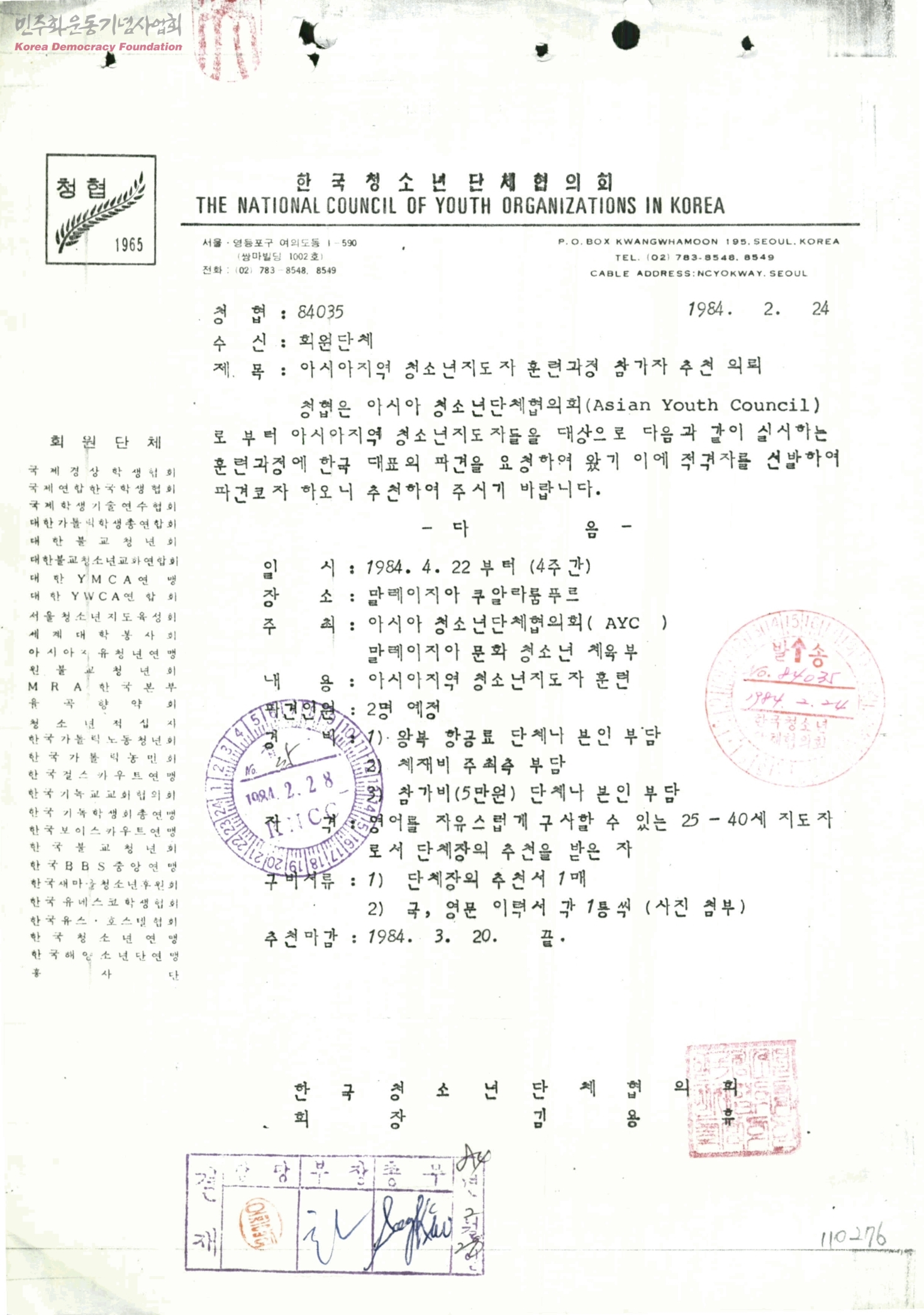 아시아지역 청소년지도자 훈련과정 참가자 추천 의뢰[수신:한국청소년단체협의회 회원단체, 발신:한국청소년단체협의회]