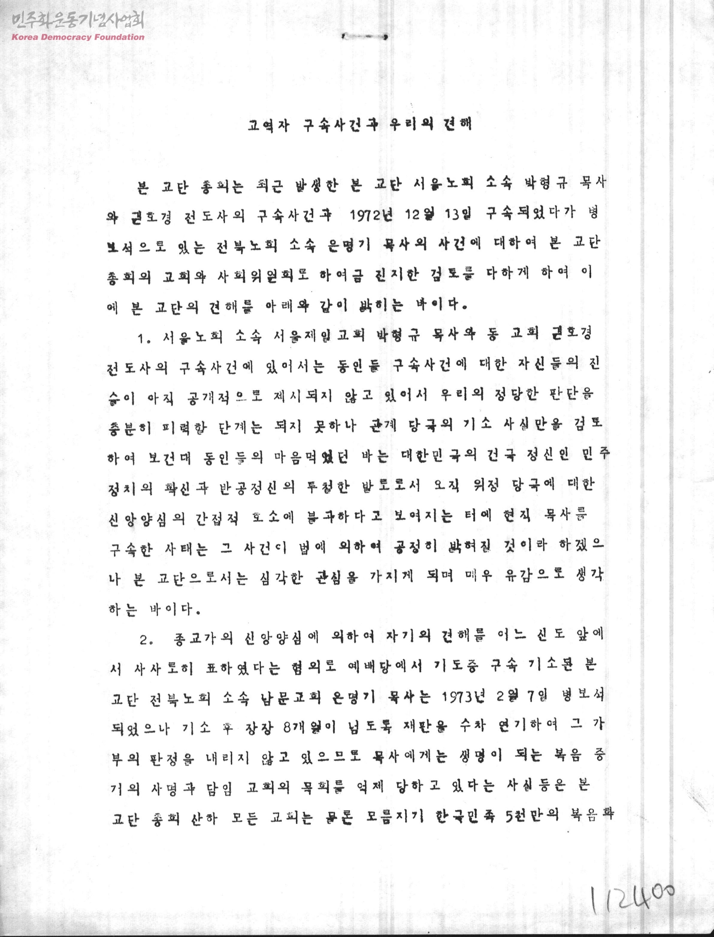 - 서울노회 소속 박형규목사와 권호경전도사의 구속사건과 보석으로 풀러난 전북노회 소속 온명기목사 재판연기에 대하여 교단의 입장 표명.