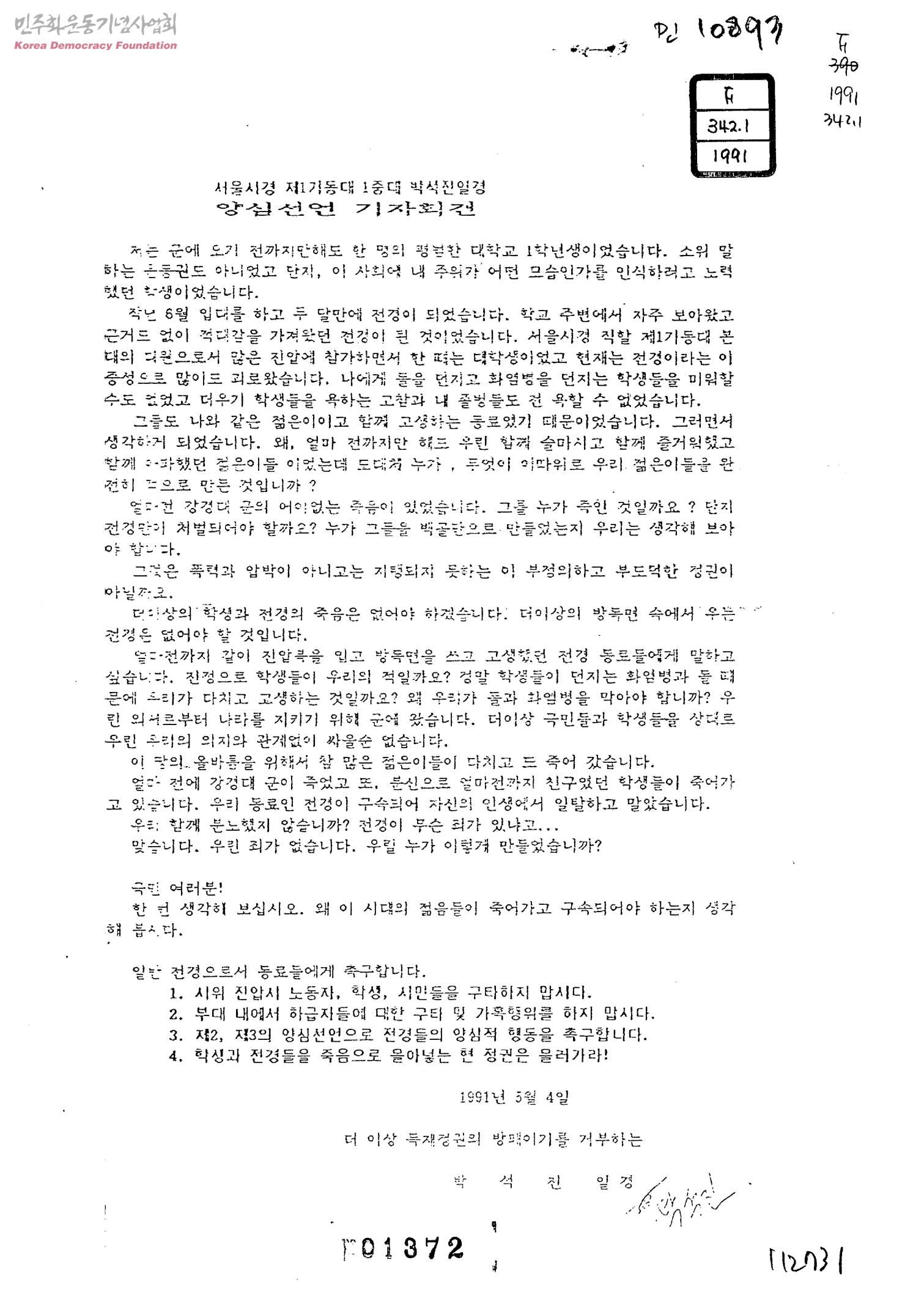 서울시경 제1기동대 1중대 박석진 일경 양심선언 기자회견
