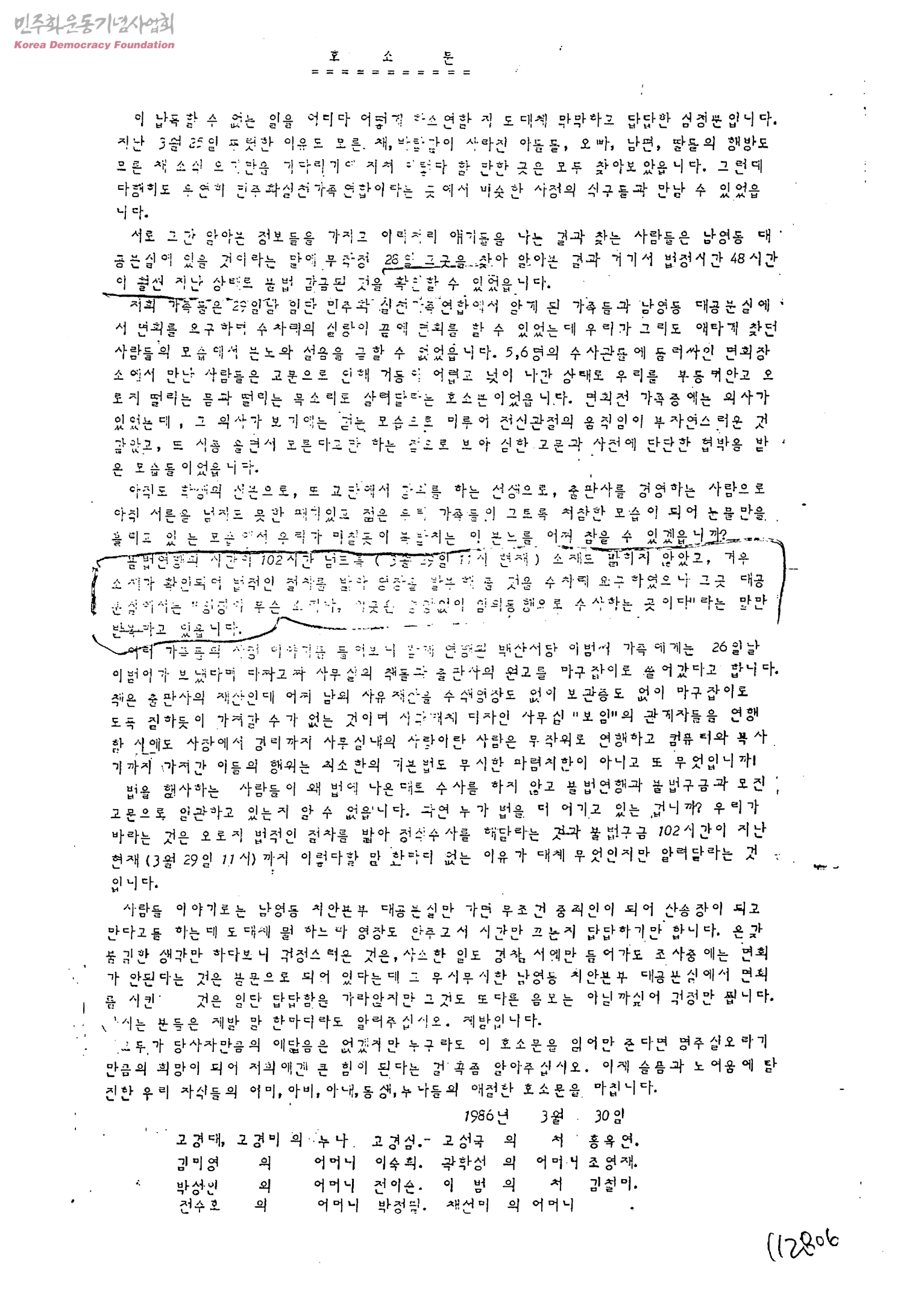 호소문[25일 불법연행 구속된 가족들의 호소문]