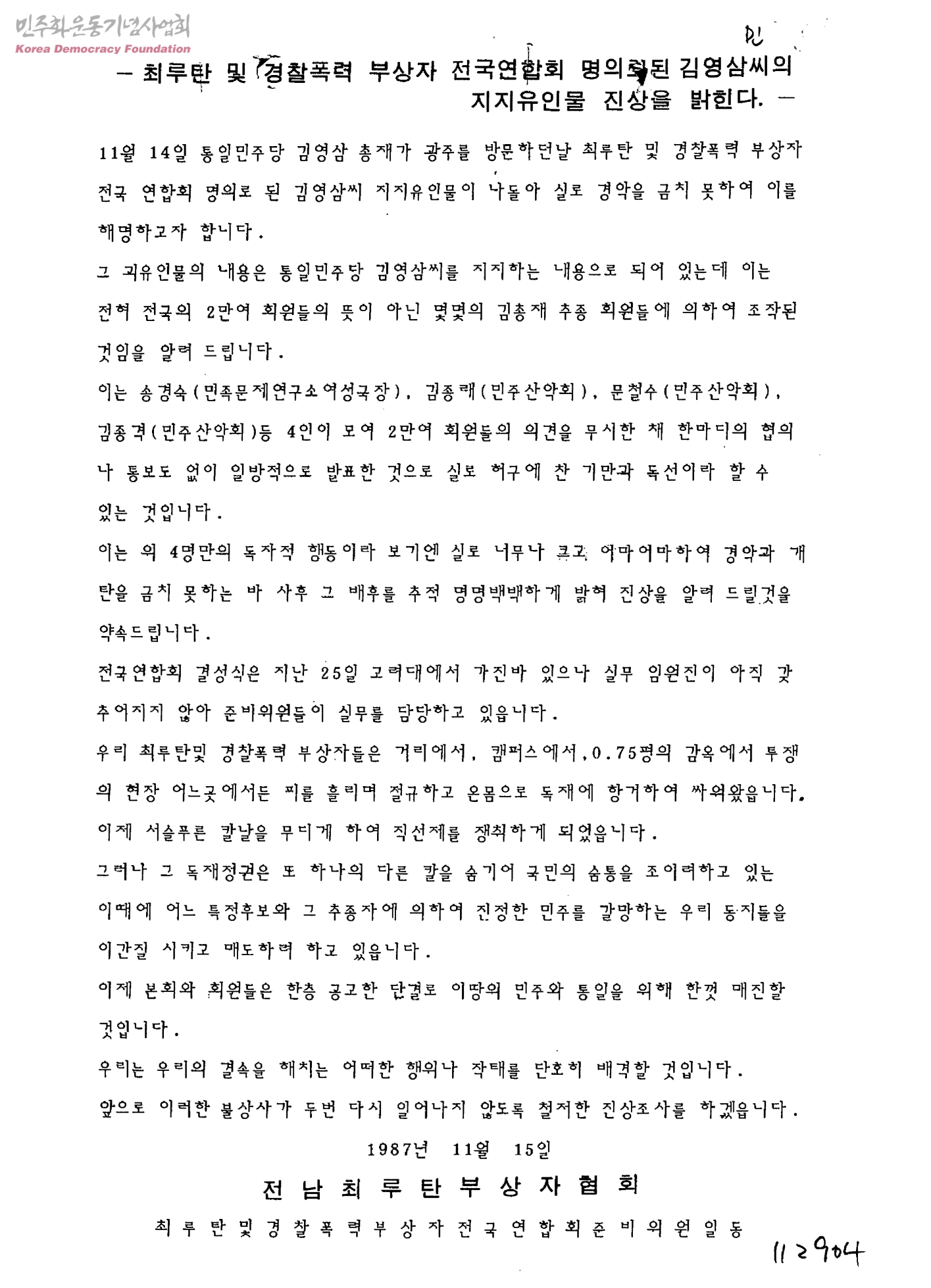 최루탄 및 경찰폭력 부상자 전국연합회 명의로 된 김영삼씨의 지지유인물 진상을 밝힌다