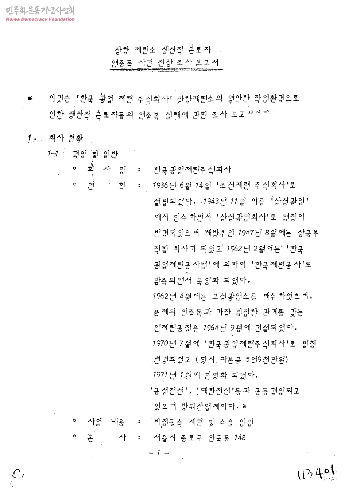 장항 제련소 생산직 근로자 연중독 사건 진상 조사 보고서