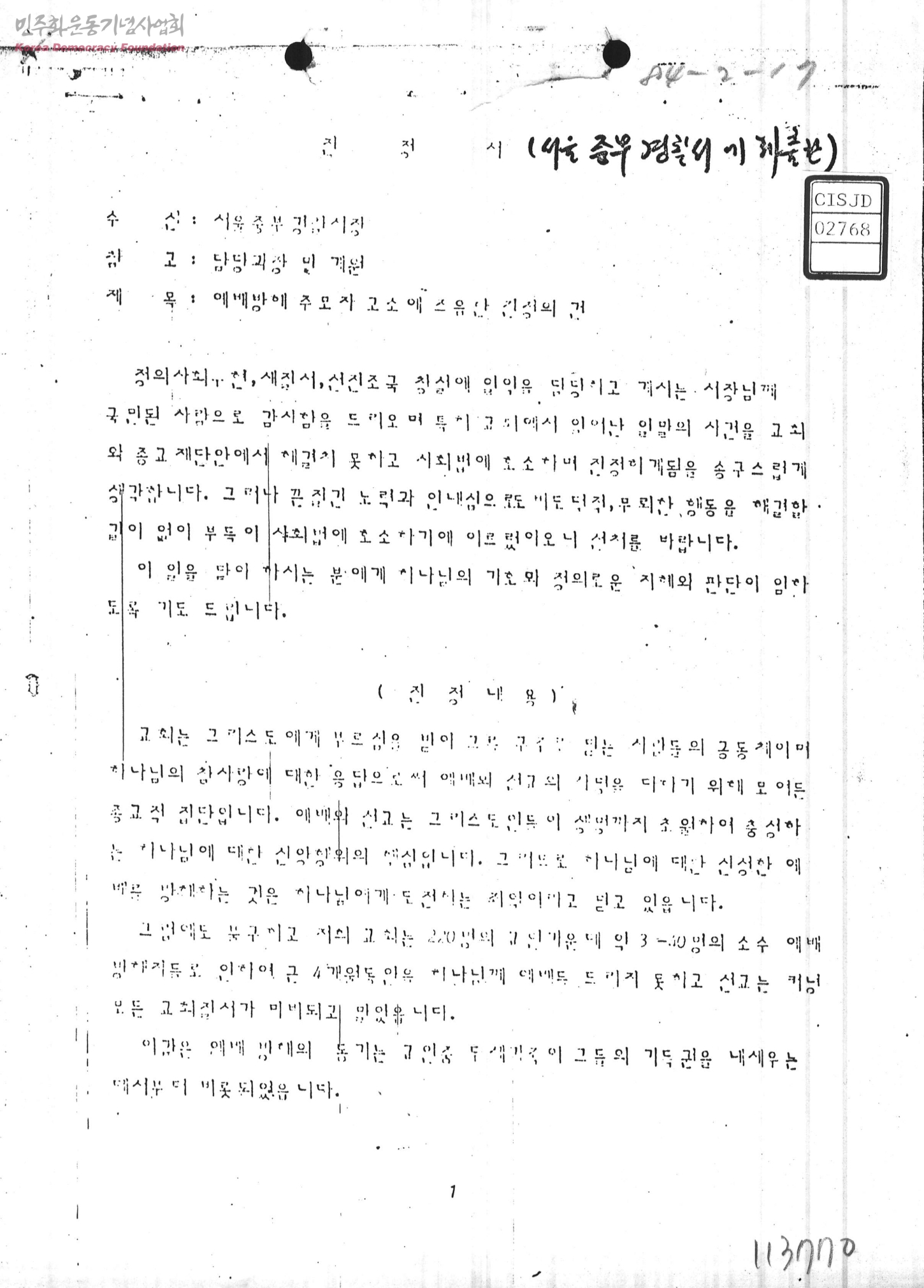 진정서-예배방해 주모자 고소에 즈음한 진정의 건[수신:서울중부경찰서장,발신:최중식,이창호]