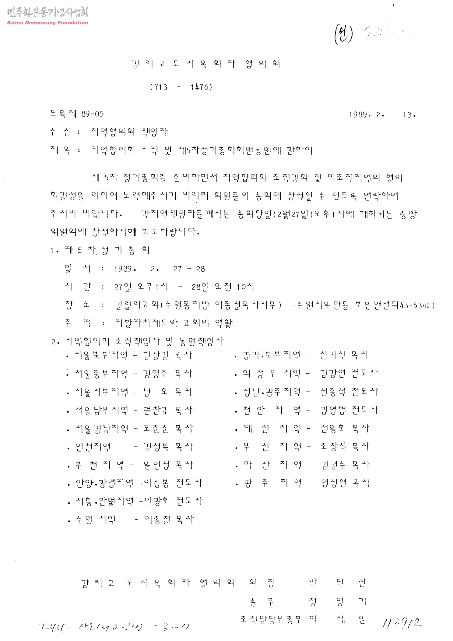 지역협의회 조직 및 제5차정기총회회원 동원에 관하여[수신: 지역협의회 책임자, 발신: 감리교도시목회자협의회]