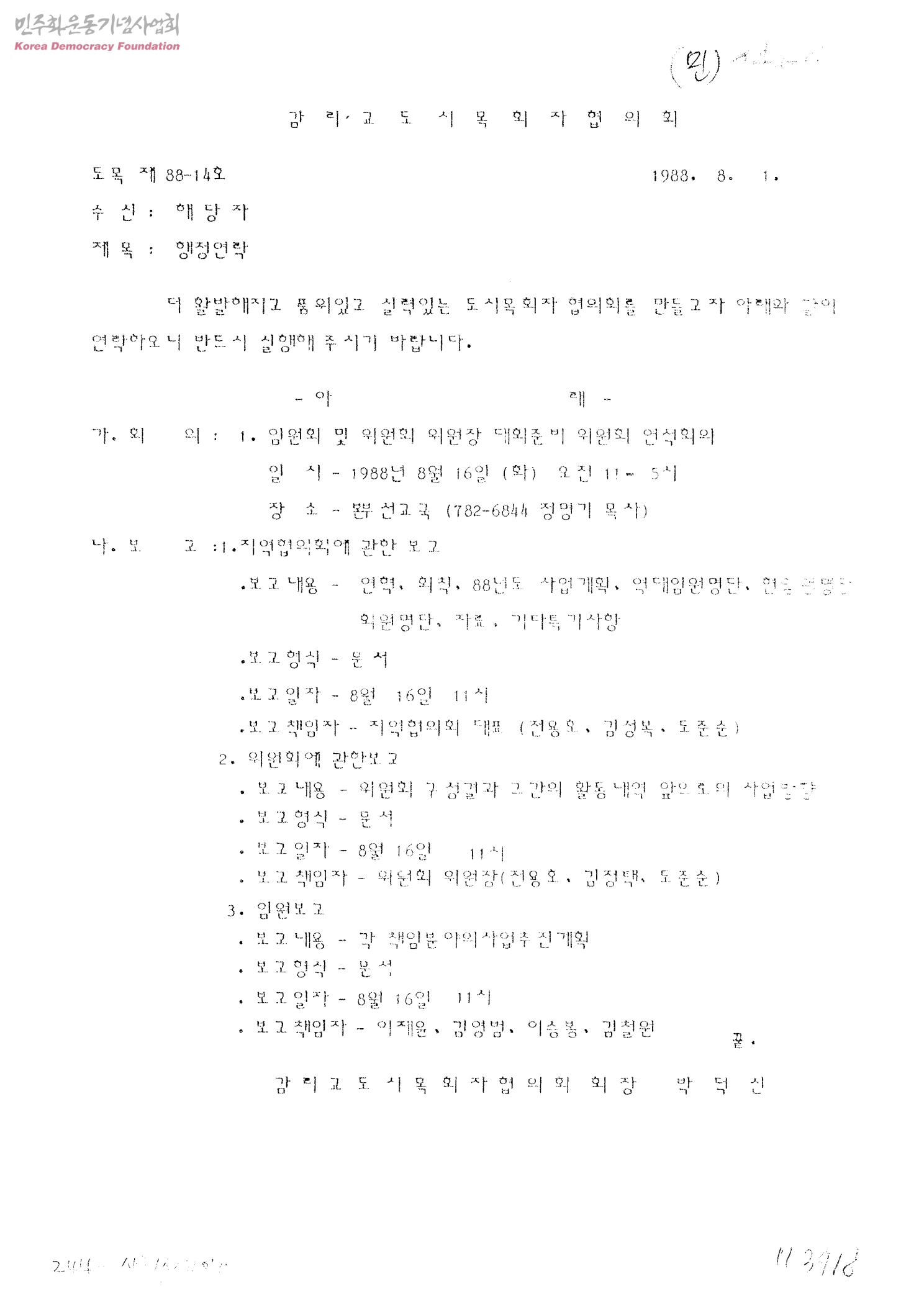 행정연락[수신:해당자, 발신: 감리교도시목회자협의회]