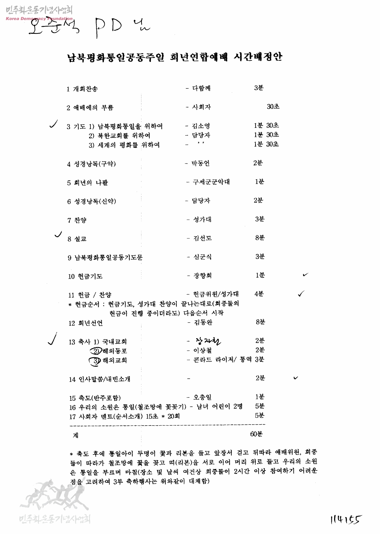 남북평화통일공동주일희년연합예배시간배정안