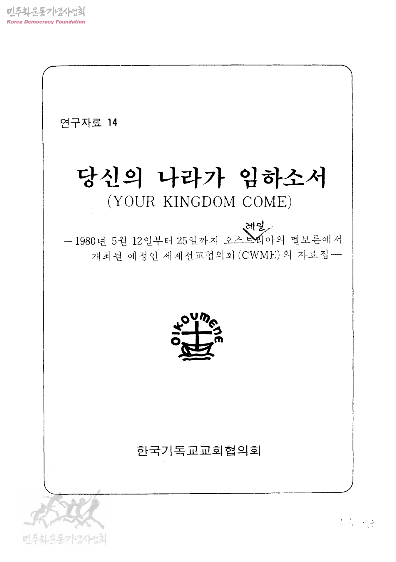 연구자료 14-당신의 나라가 임하소서(YOUR KINGDOM COME)-1980년 5월 12일부터 25일까지 오스트레일리아의 멜보른에서 개최될 예정인 세계선교협의회(CWME)의 자료집