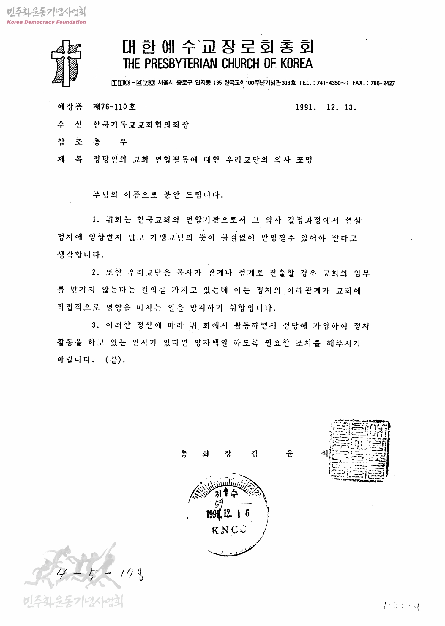 정당인의 교회 연합활동에 대한 우리교단의 의사 표명[수신:한국기독교교회협의회장]