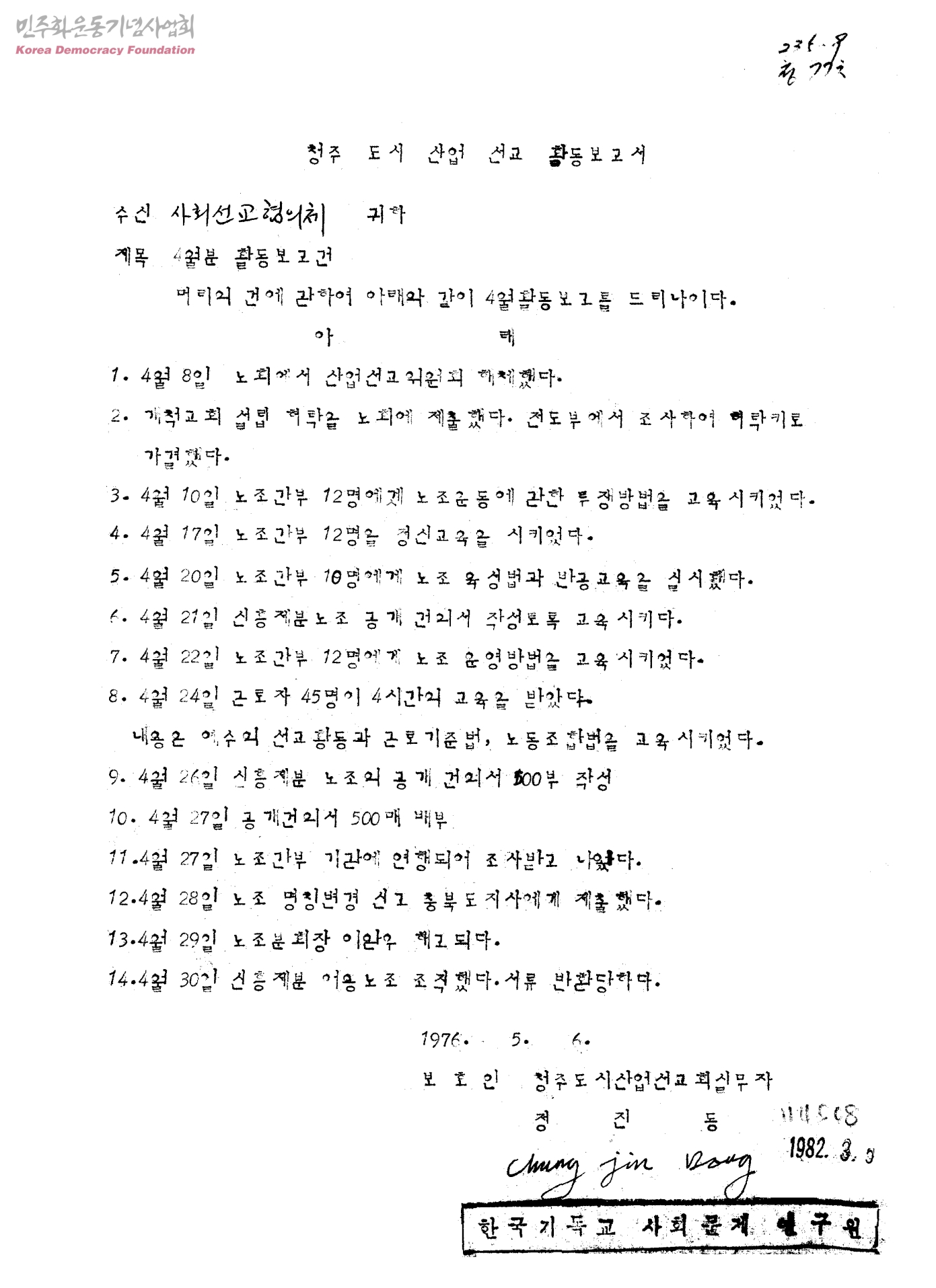 청주도시산업선교 활동보고서-4월분 활동보고건[수신:사회선교협의체]