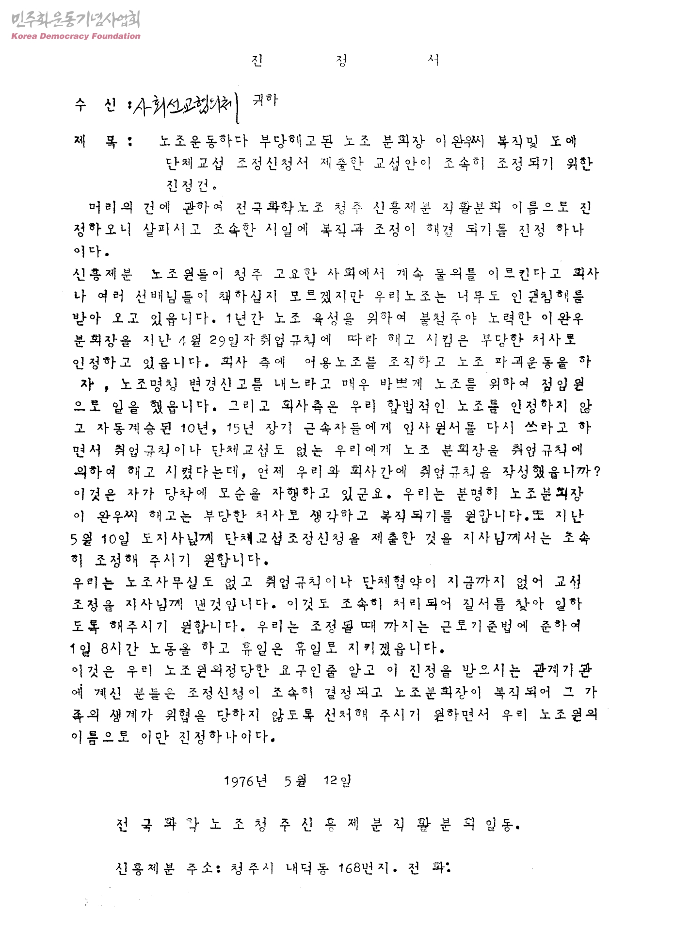 노조운동하다 부당해고된 노조 분회장 이완우씨 복직 및 도에단체교섭 조정신청서 제출한 교섭안이 조속히 조정되기 위한 진정건[수신:사회선교협의체]