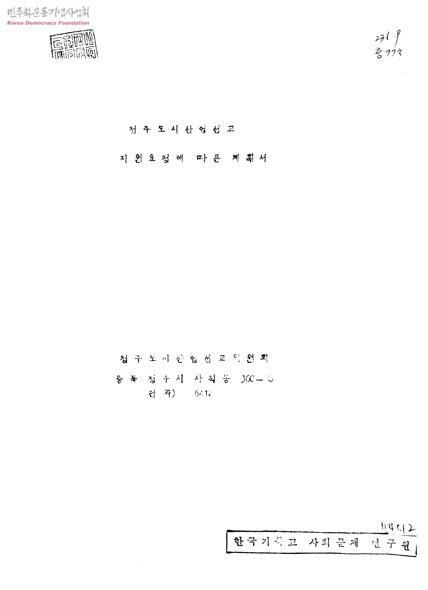 청주도시산업선교지원요청에 따른 계획서