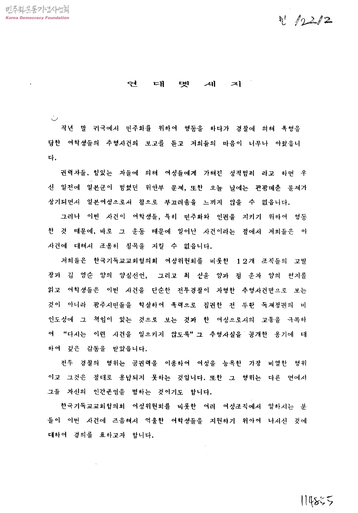 연대멧세지[민주운동을 하다가 경찰에 폭행당한 여학생들 추행사건 관련]