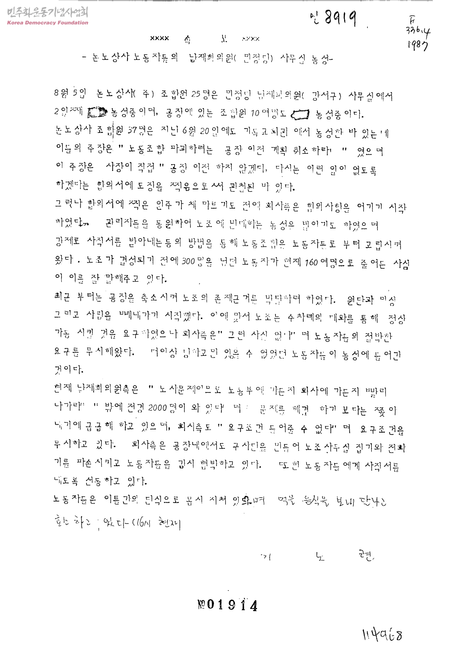 속보-논노상사 노동자들의 남재희위원(민정당) 사무실 농성