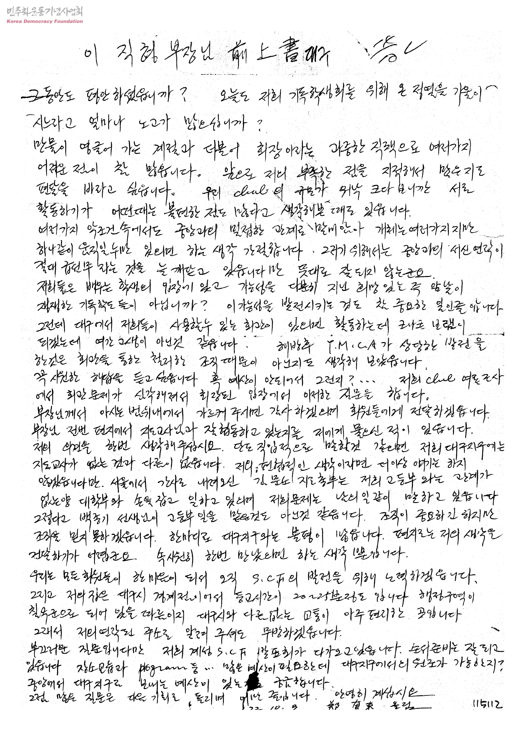 [이직형에게 기독학생회 활동 관련하여 정재동이 보내는 편지]