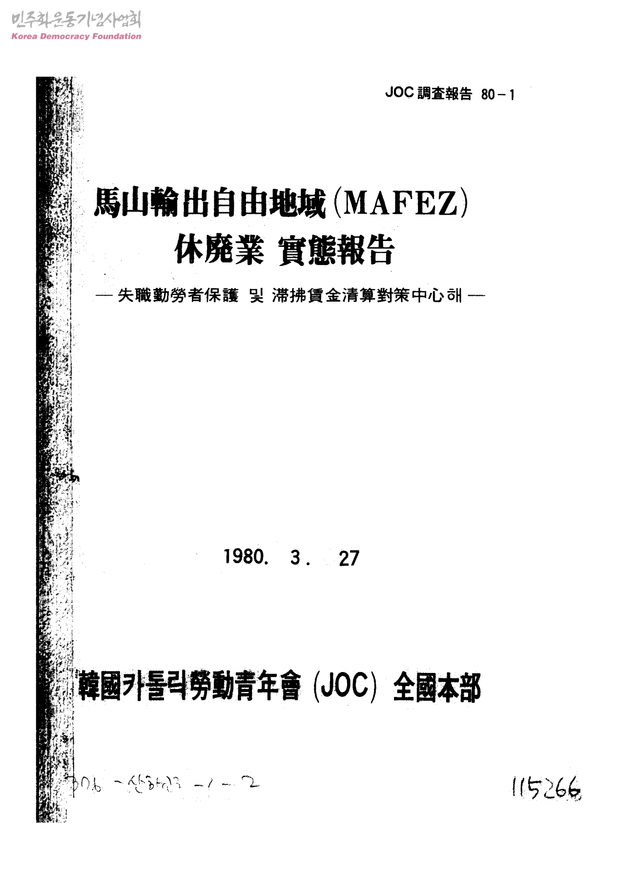 馬山輸出自由地域(MAFEZ)休㾱業 實態報告-失職勞動者保護 및 滯拂賃金淸算對策中心해-