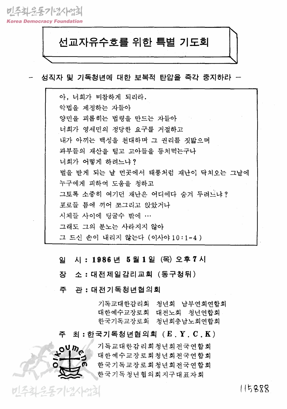 선교자유수호를 위한 특별 기도회-성직자 및 기독청년에 대한 보복적 탄압을 즉각 중지하라