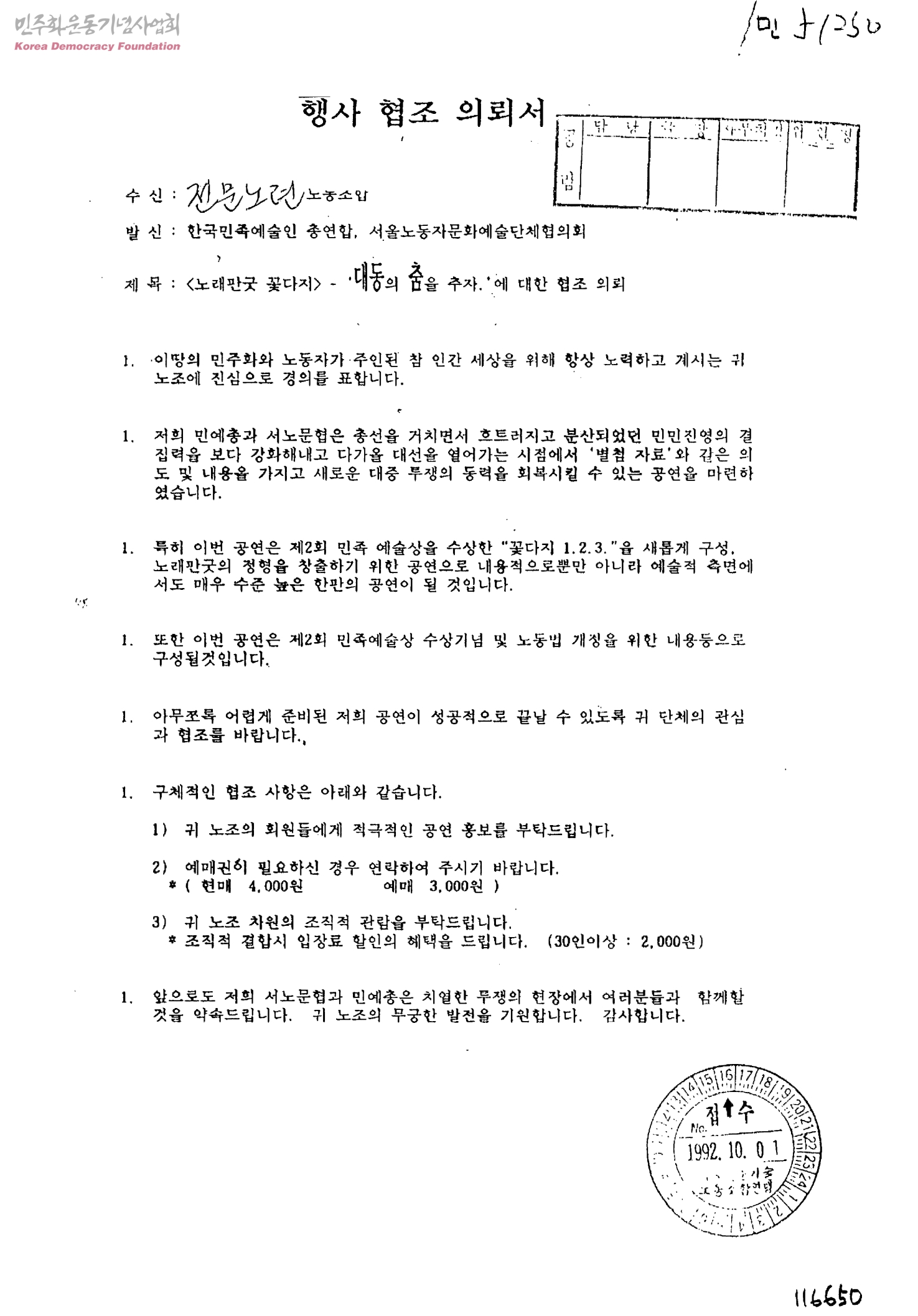 <노래판굿 꽃다지>-대동의 춤을 추자.에 대한 협조 의뢰[수신:전문노련노동조합, 발신:한국민족예술인총연합, 서울노동자문화예술단체협의회]