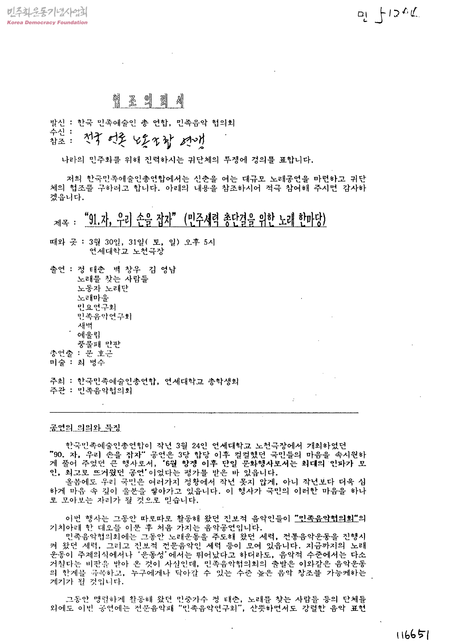 91. 자, 우리 손을 잡자 행사 참여 요청[수신:전국언론노동조합연맹, 발신:한국민족예술인총연합, 민족음악협의회]