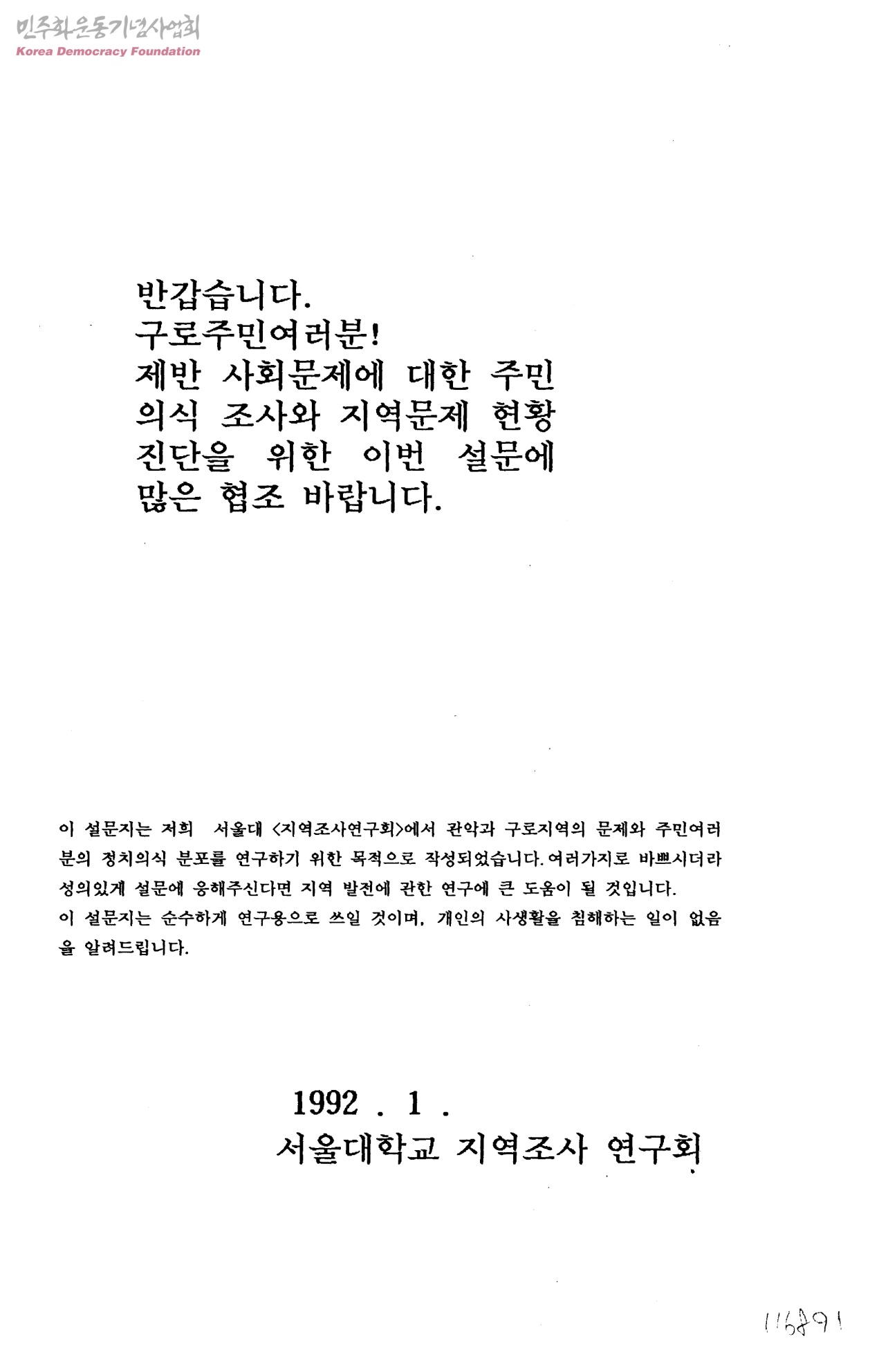 반갑습니다. 구로주민여러분! 제반 사회문제에 대한 주민 의식 조사와 지역문제 현황 진단을 위한 이번 설문에 많은 협조 바랍니다