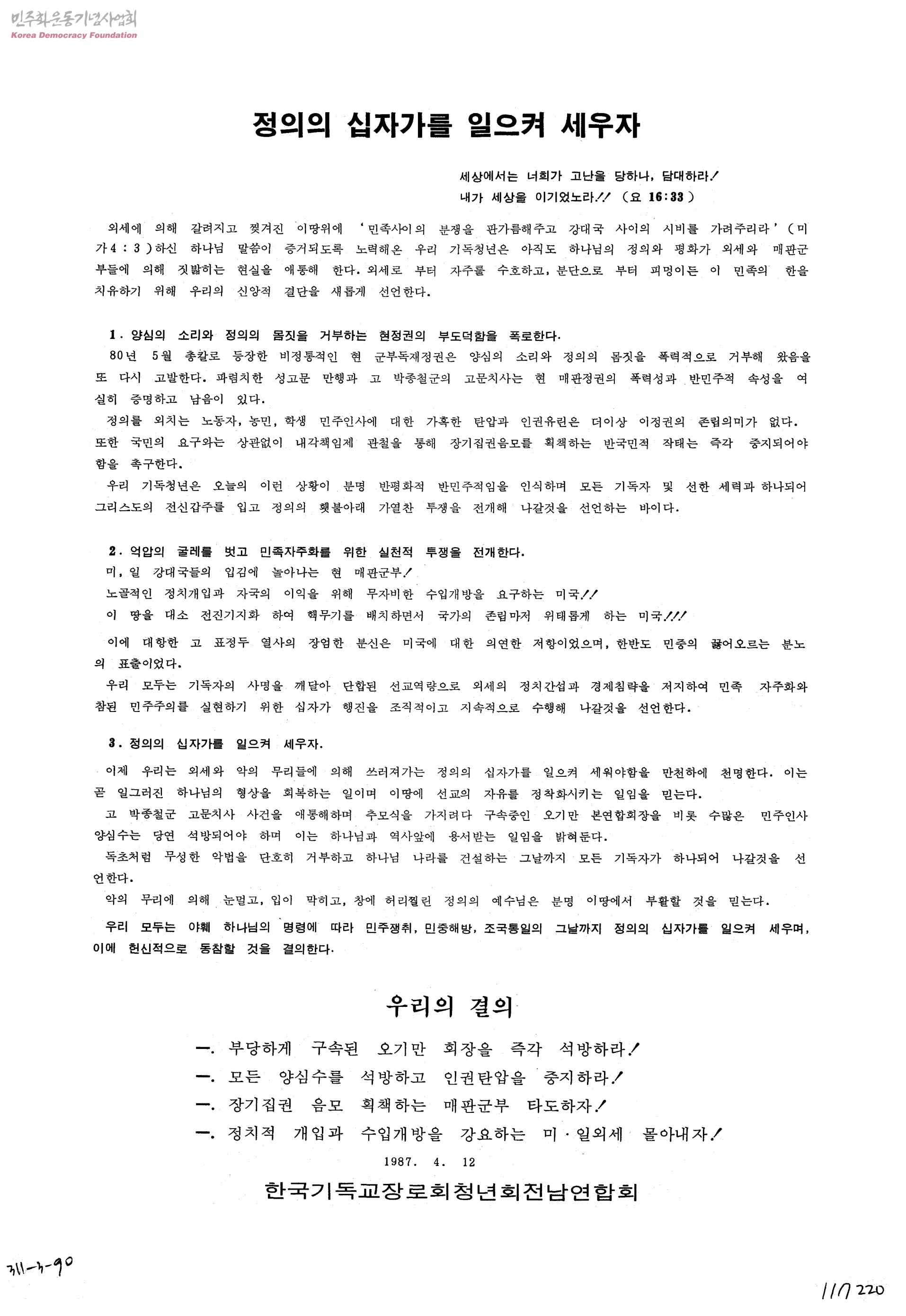 - 생산자 및 기증자가 ‘박용수’인 사진의 사용은 구매신청을 클릭하여 직접 사진 구매 신청을 하실 수 있습니다. 생산자 및 기증자가 ‘경향신문사’인 사진의 사용은 경향신문사 담당자(02-3701-1635)를 통해 구매하실 수 있습니다. 그 외의 생산자 및 기증자는 민주화운동기념사업회 사료관 담당자( hyunchaek@kdemo.or.kr / 02-6440-8961 )에 문의바랍니다.