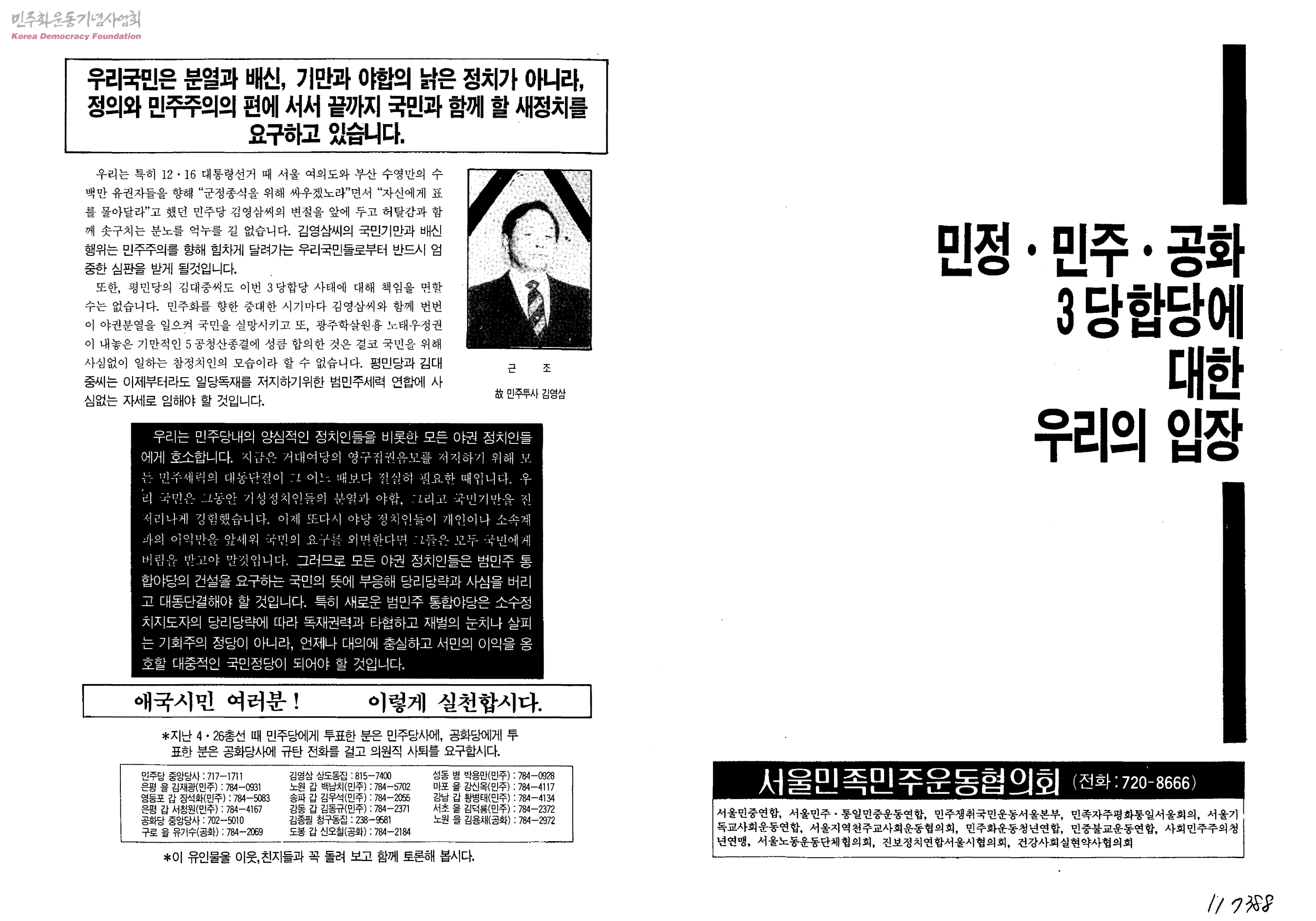 민정ㆍ민주ㆍ공화 3당합당에 대한 우리의 입장
