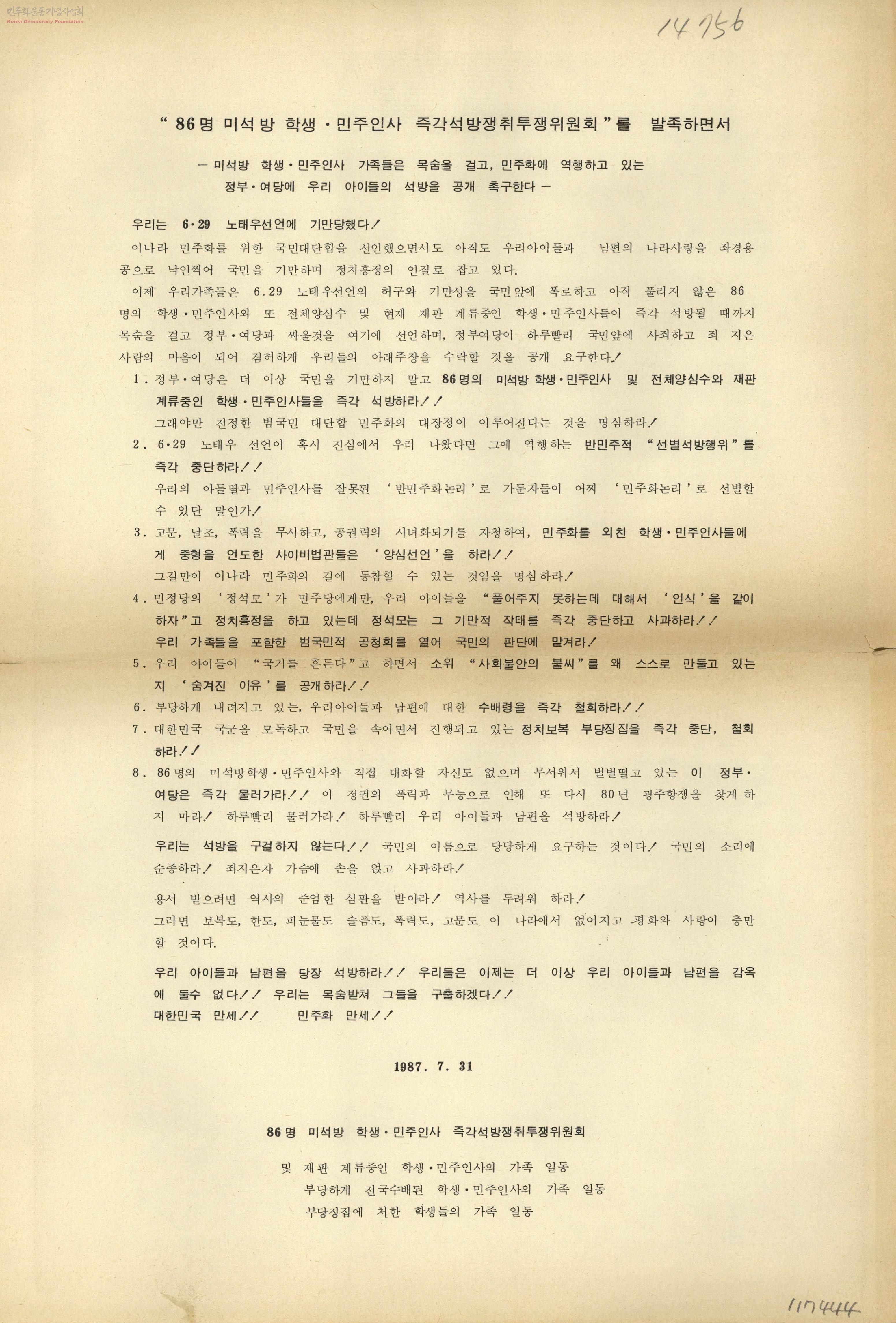 "86명 미석방 학생·민주인사 즉각석방쟁취투쟁위원회"를 발족하면서-미석방 학생·민주인사 가족들은 목숨을 걸고, 민주화에 역행하고 있는 정부여당에 우리 아이들의 석방을 공개 촉구한다