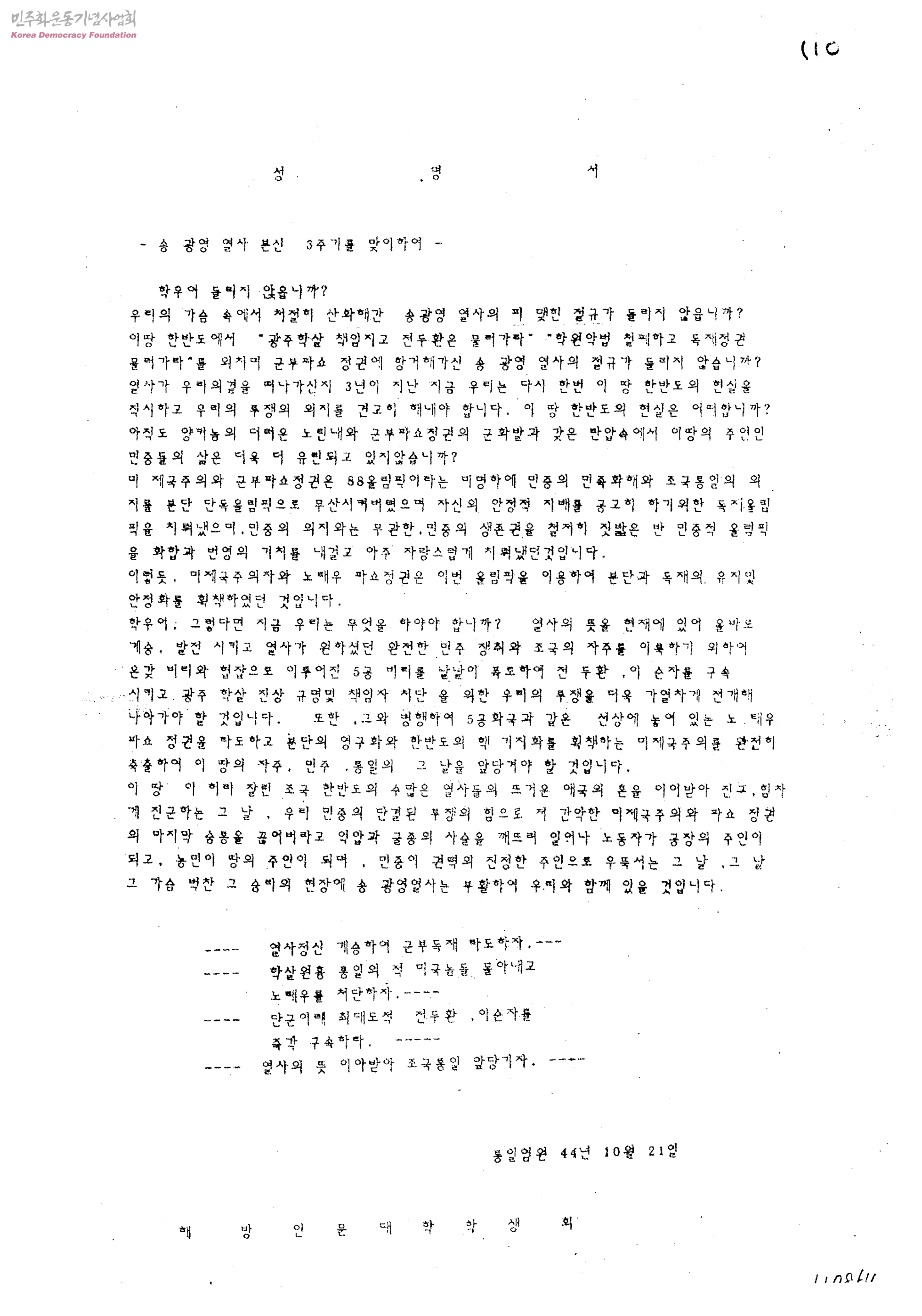 성명서-송광영 열사 본신 3주기를 맞이하여