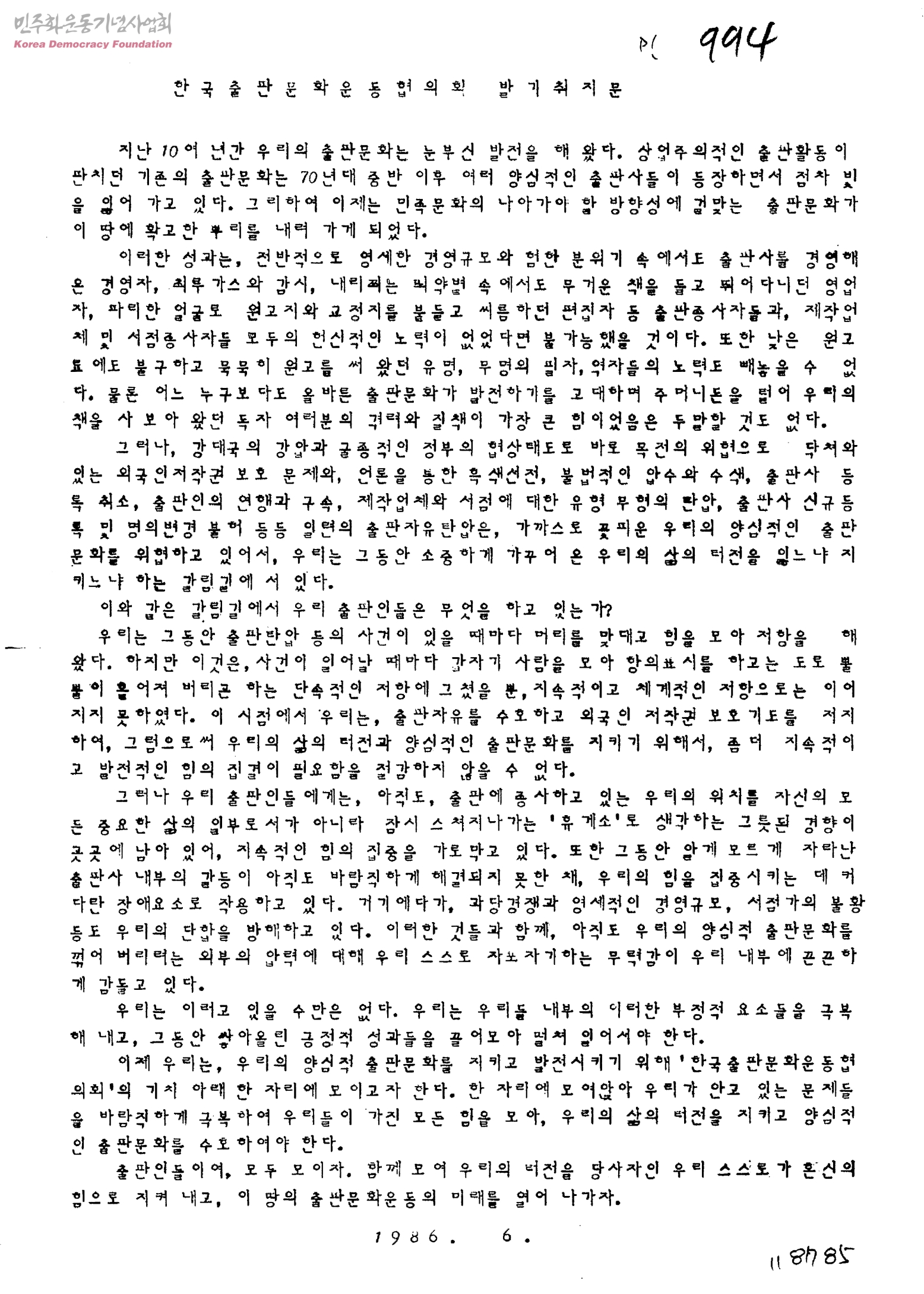 한국출판문화운동협의회 발기취지문